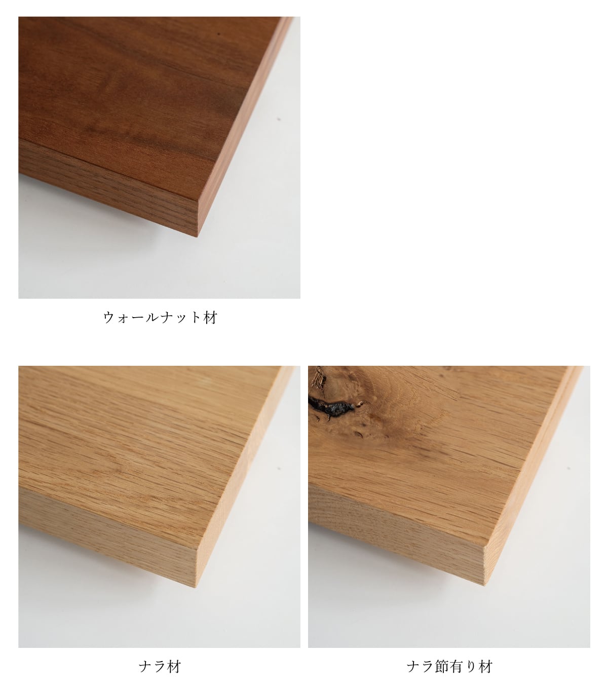 天板は、ウォールナット、ナラ、ナラ節有り、の3種類からお選びいただけます。