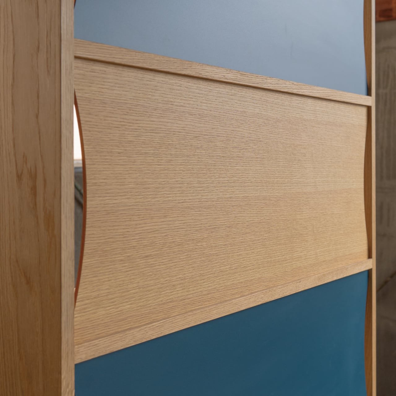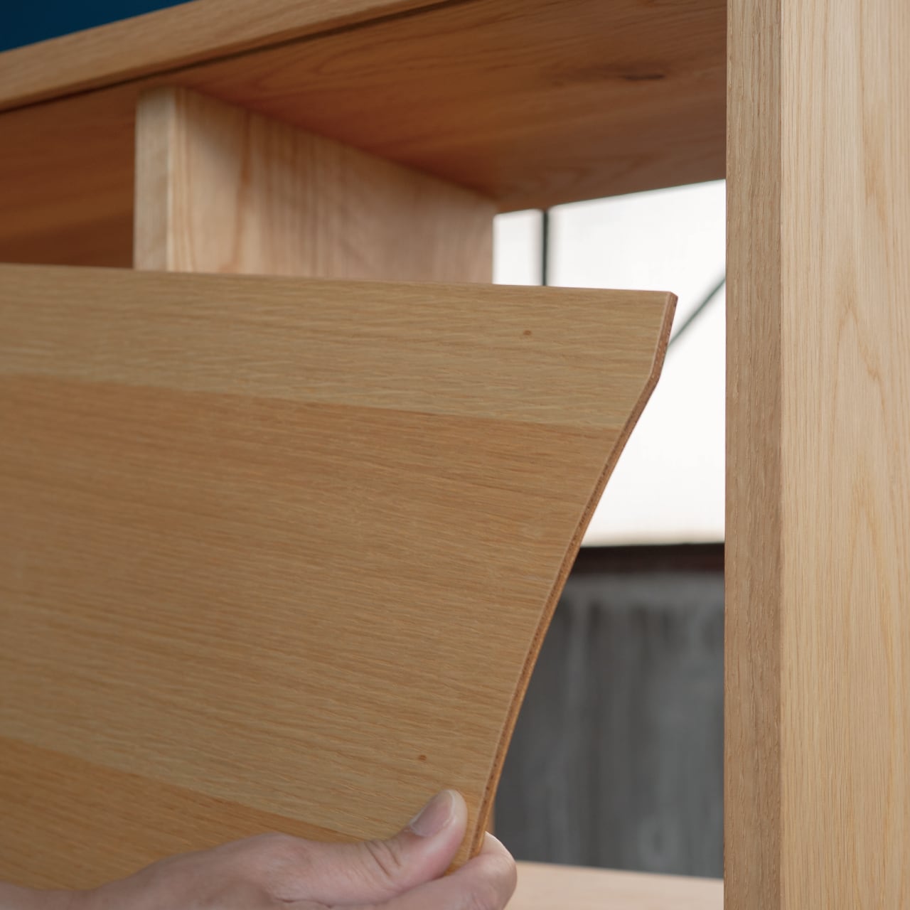 各段ごとに取り外しが可能な背板は、本体の無垢材と同樹種の突板化粧合板とカラーのメラミン化粧合板とのリバーシブル。お好みやその時のインテリアに合わせて変えることもできます。