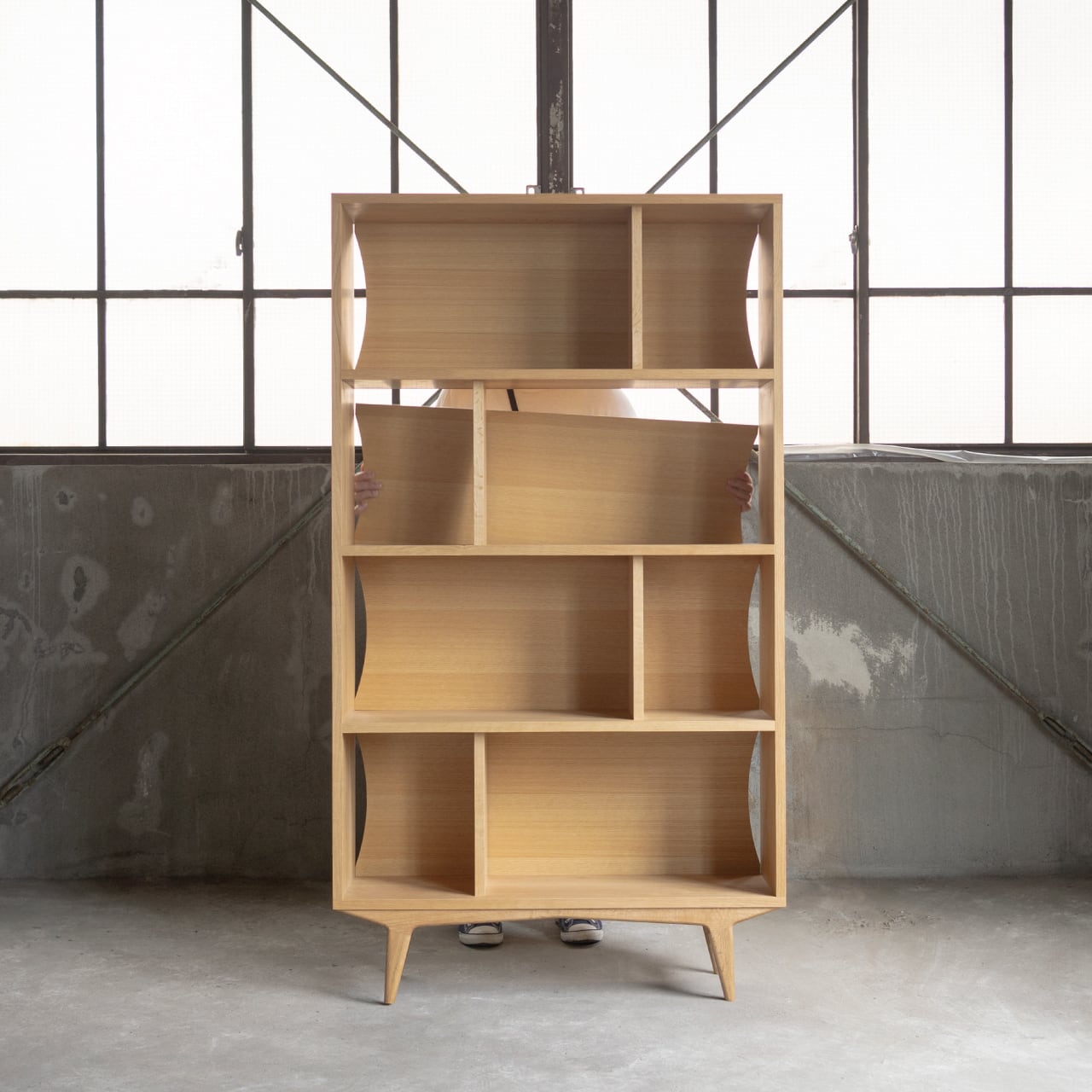 縦の仕切り板が交互に配置されているため、ジャンル別、作家別など自由に分けてお楽しみいただけます。また、場所によっては、表紙を見せるように本を飾ったり、小物やオブジェを並べるなど、本を整理・収納するだけにとどまらない楽しみ方があります。