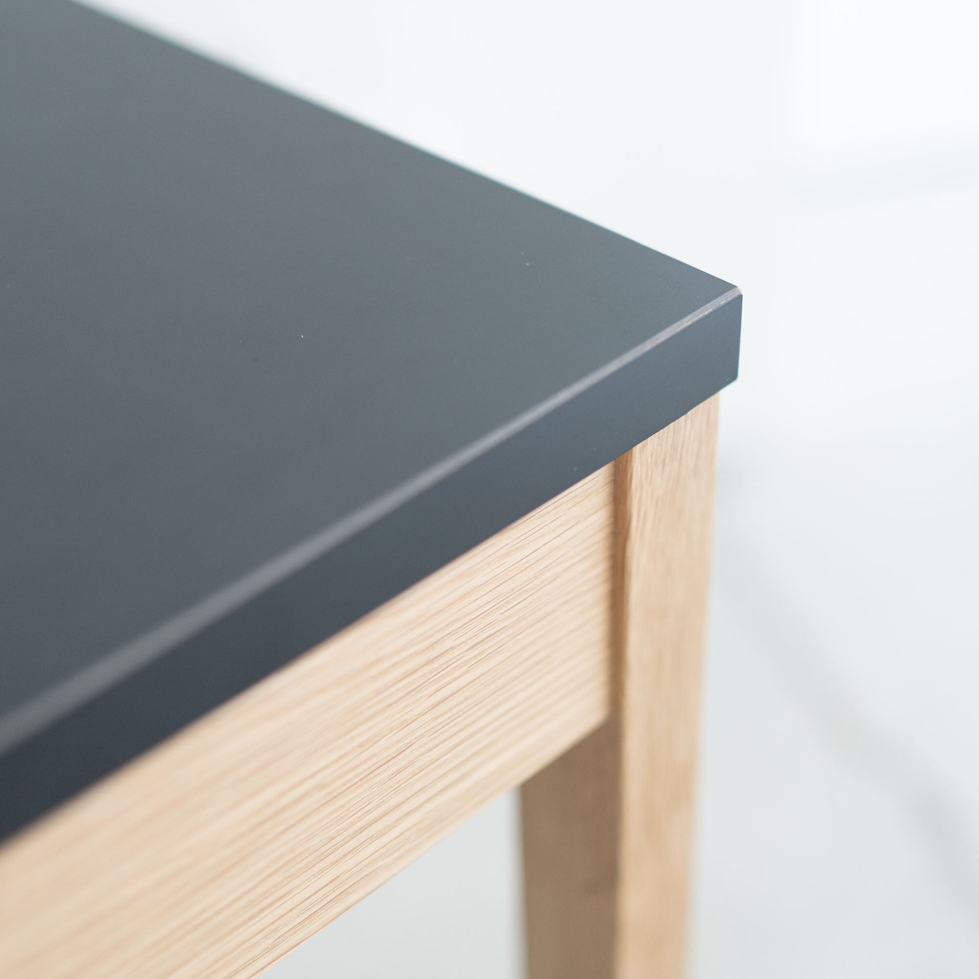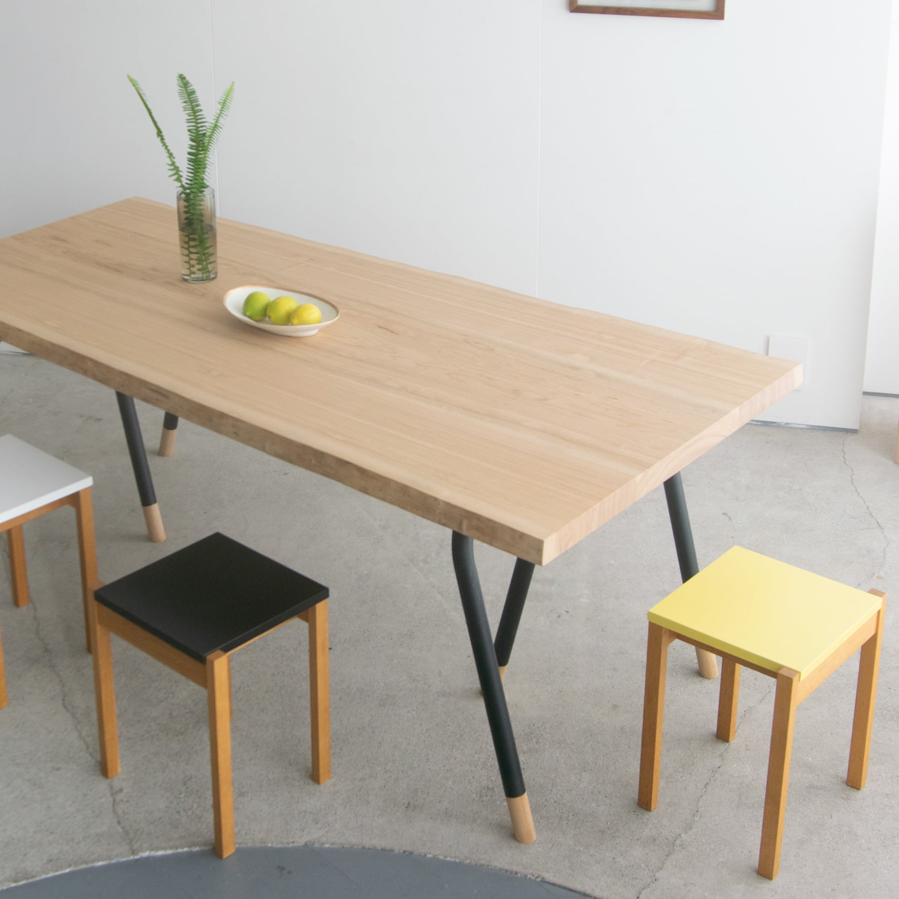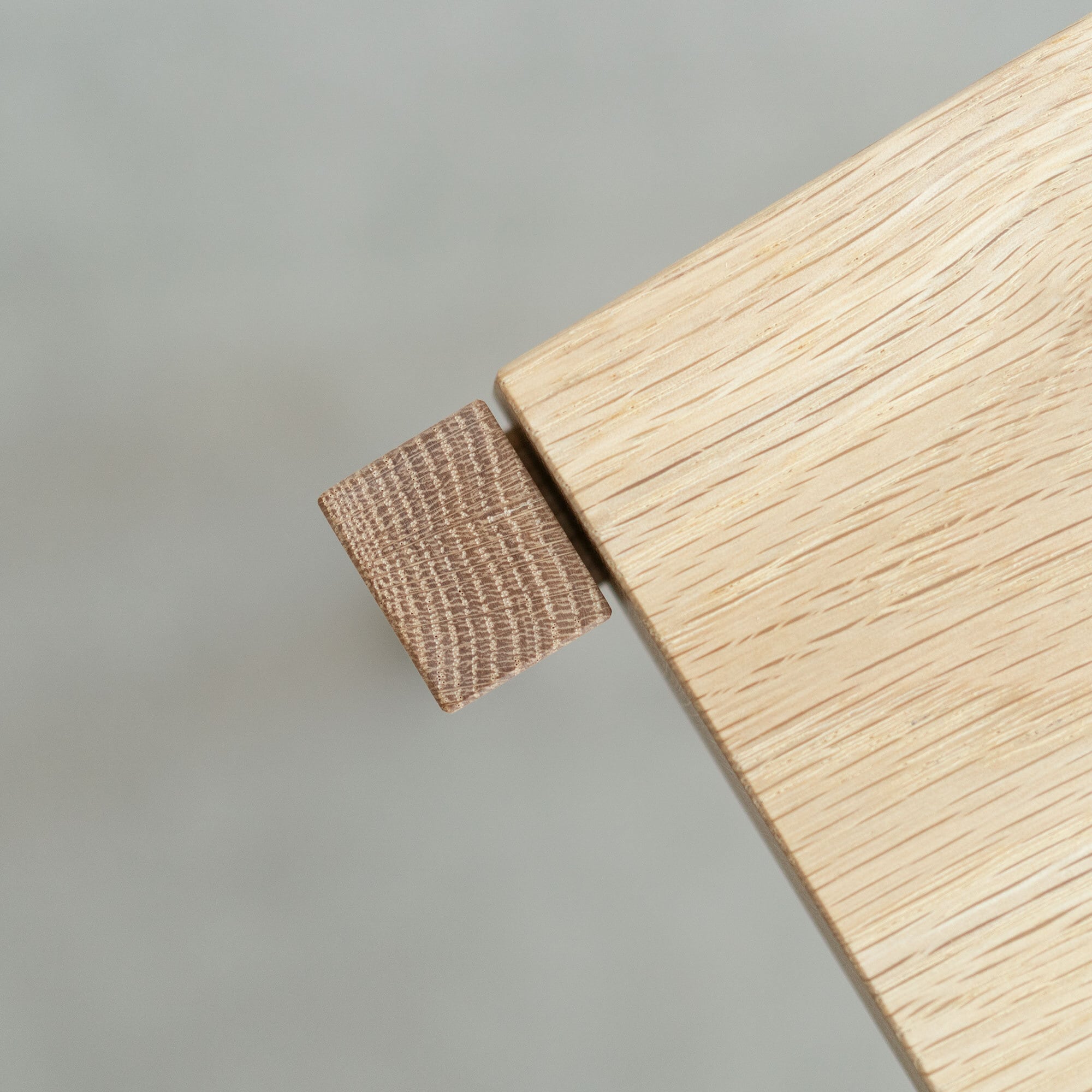 強く、粘りのある素材で、オイル塗装仕上げにより滑らかな肌触りと、木の表情をお楽しみいただけます。ナラ材は木目に丸みがあり表情が豊かで、天然の素材ならではの魅力があります。シンプルなデザインと素材感のコントラストをお楽しみください。