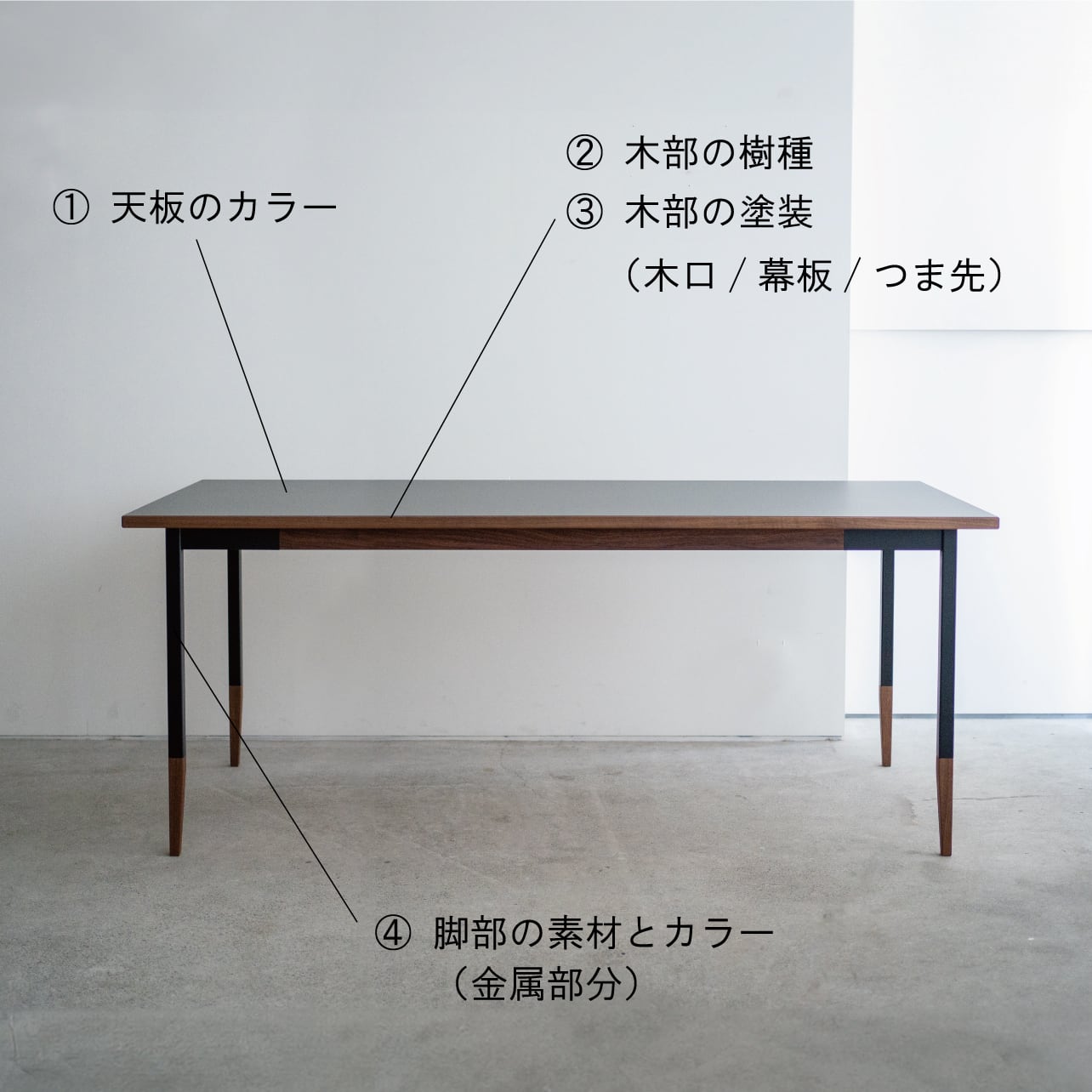 様々なご要望にお応えできるように、オルタナティブテーブルでは、天板、脚部、塗装、を自由に組み合わせて頂くことで、多様なバリエーションの中からお客様のご要望にぴったりな一台をお選びいただけるように考えました。