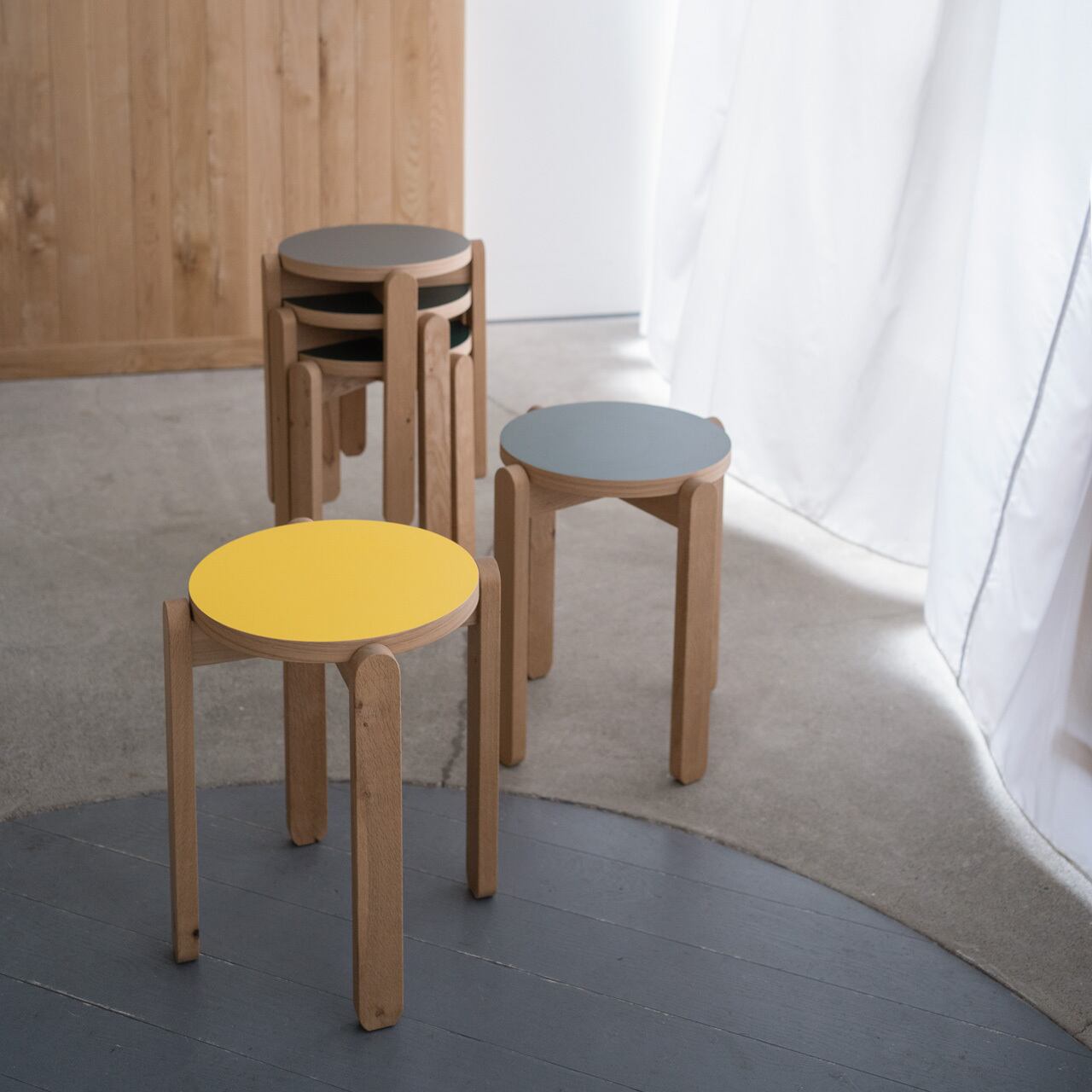角のない丸いフォルムは、空間に馴染み、狭いお部屋や限られたスペースでも安心してお使いいただくことができます。また、スタッキングが可能なので、カフェやパブリックスペース等での使用にも適しています。脚部には無垢のナラ材を贅沢に使用し、天板と座面はお手入れしやすいメラミン素材を合わせました。