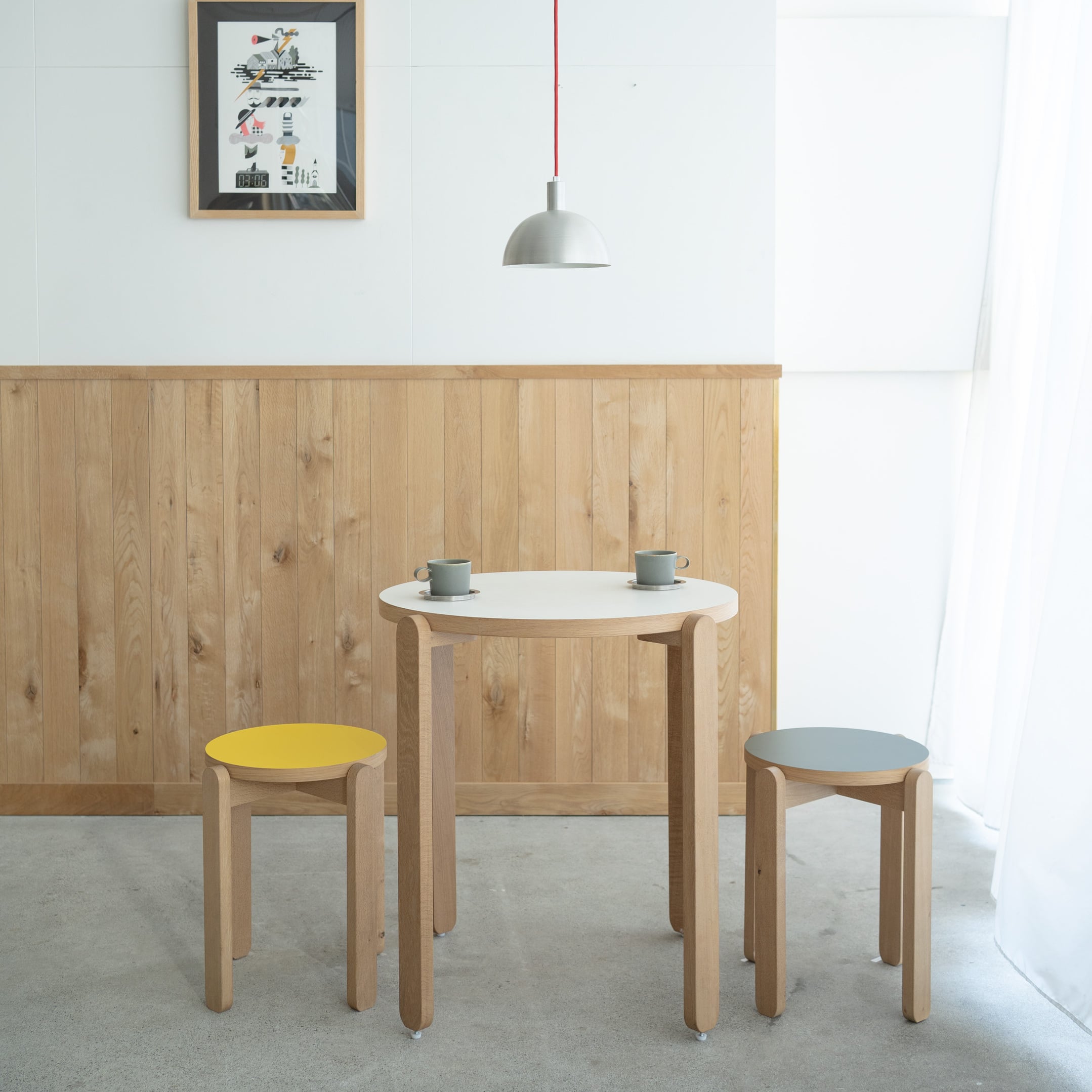 角のない丸いフォルムは、空間に馴染み、狭いお部屋や限られたスペースでも安心してお使いいただくことができます。また、スタッキングが可能なので、カフェやパブリックスペース等での使用にも適しています。脚部には無垢のナラ材を贅沢に使用し、天板と座面はお手入れしやすいメラミン素材を合わせました。
