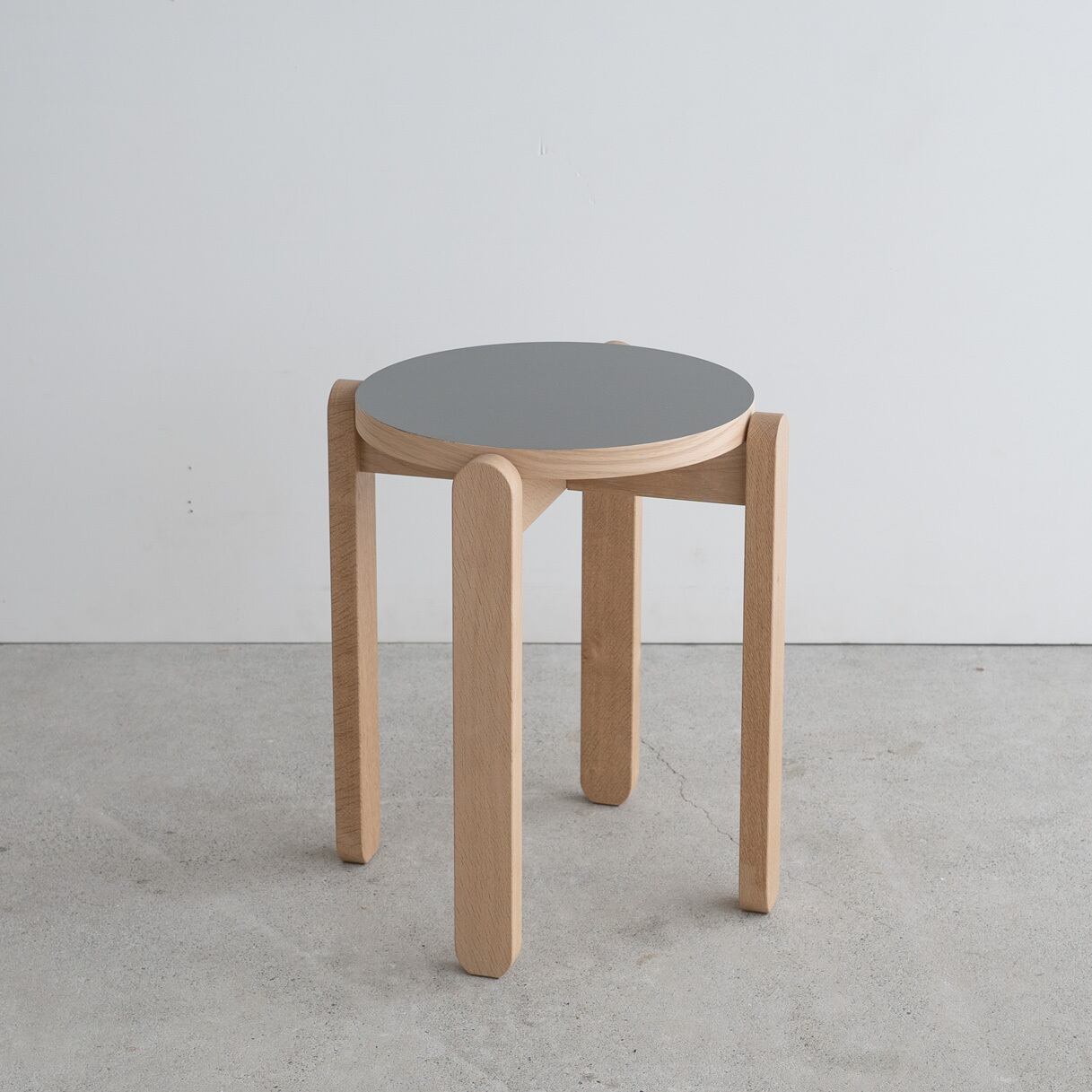角のない丸いフォルムは、空間に馴染み、狭いお部屋や限られたスペースでも安心してお使いいただくことができます。また、スタッキングが可能なので、カフェやパブリックスペース等での使用にも適しています。脚部には無垢のナラ材を贅沢に使用し、天板と座面はお手入れしやすいメラミン素材を合わせました。