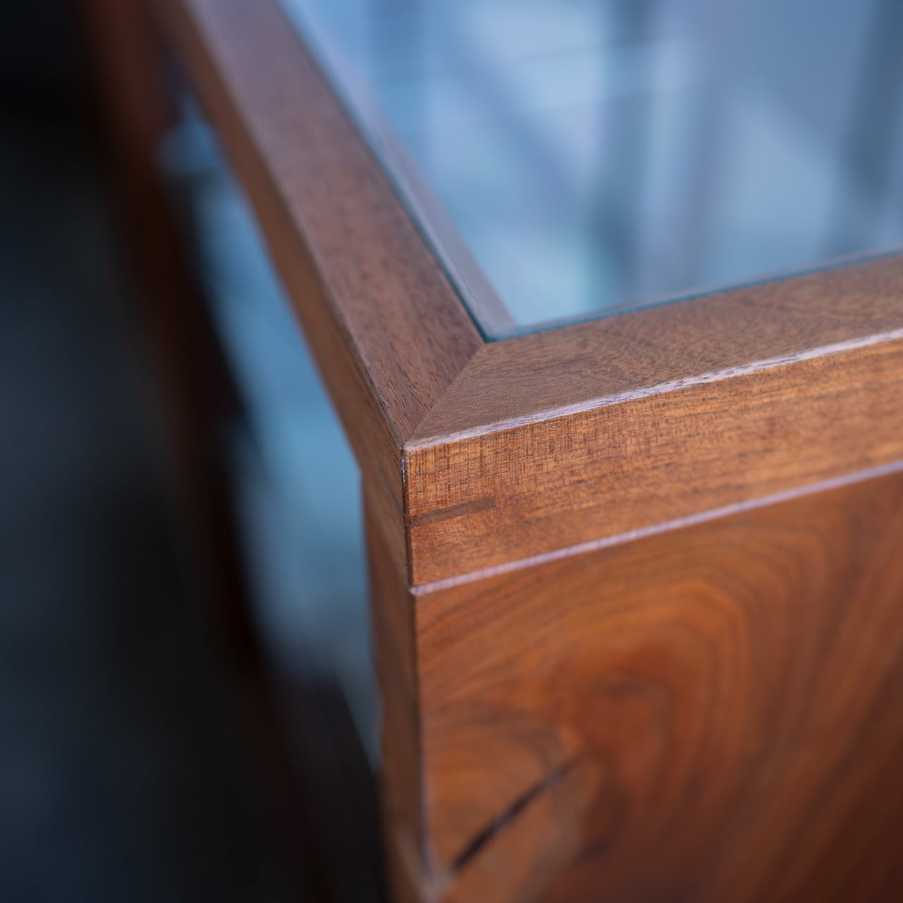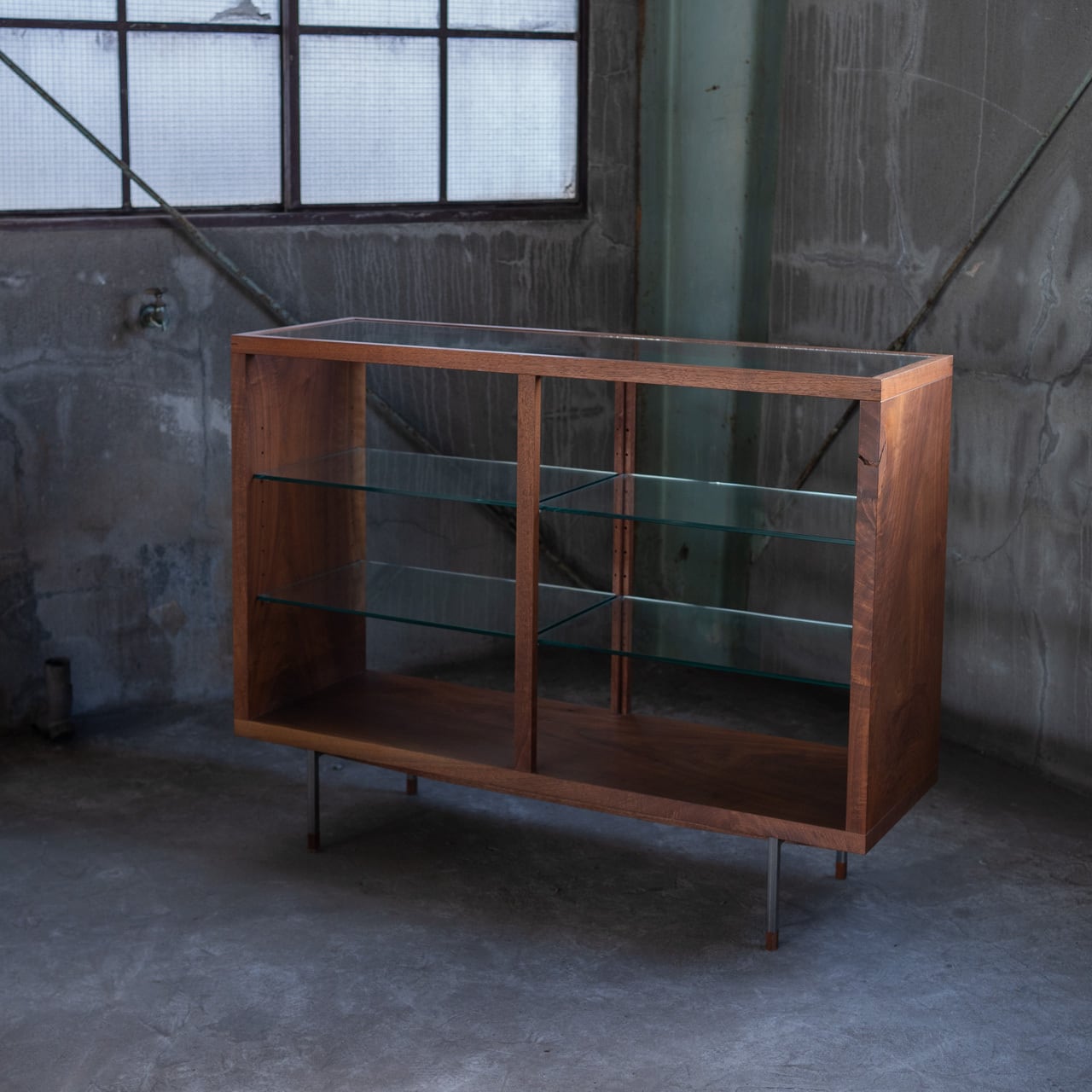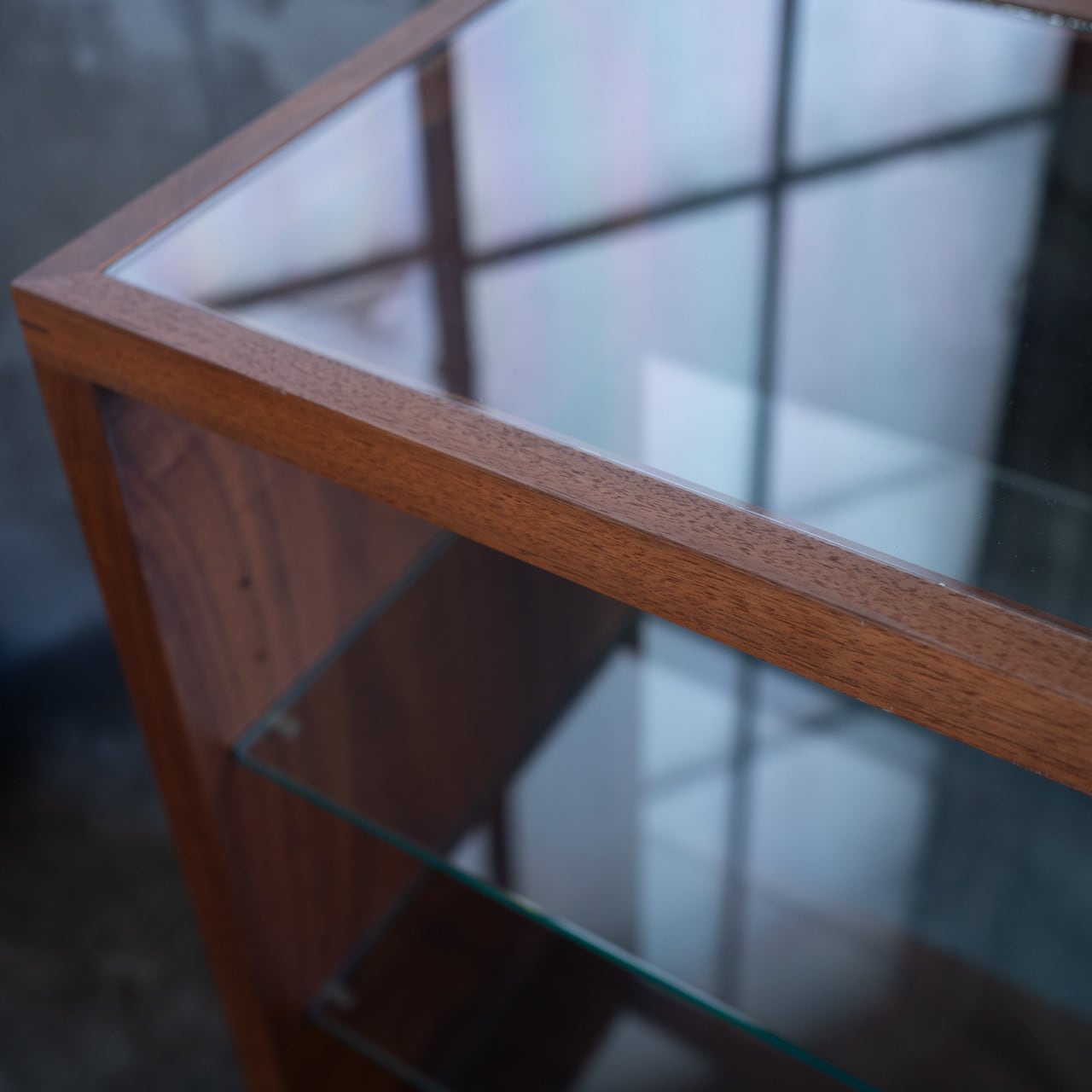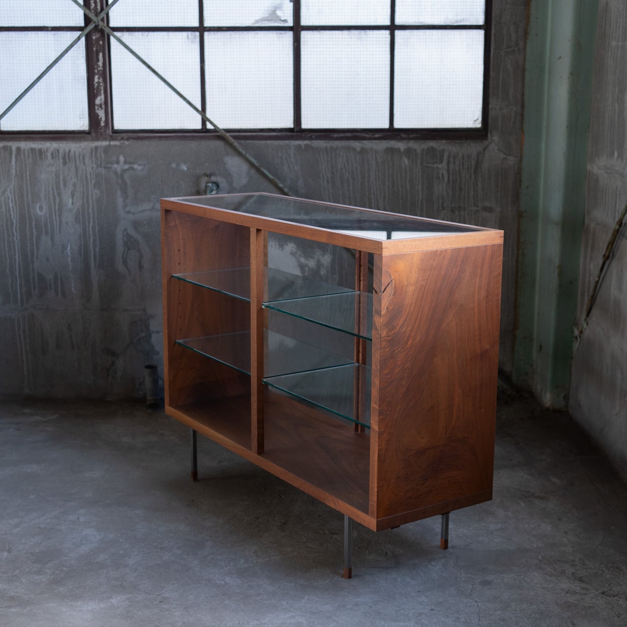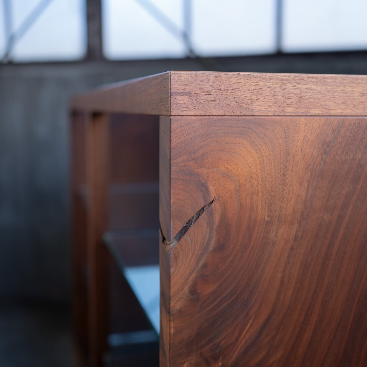 テーブルに使う厚みのある無垢のウォールナット一枚板を贅沢に使って製作しました。上部フレーム、両側面と底板、全て同じ一枚の板から木取りをしています。大きく入った節も表情の一つとしてあえて見せて使いました。特別なものを飾りたくなるキャビネットです。