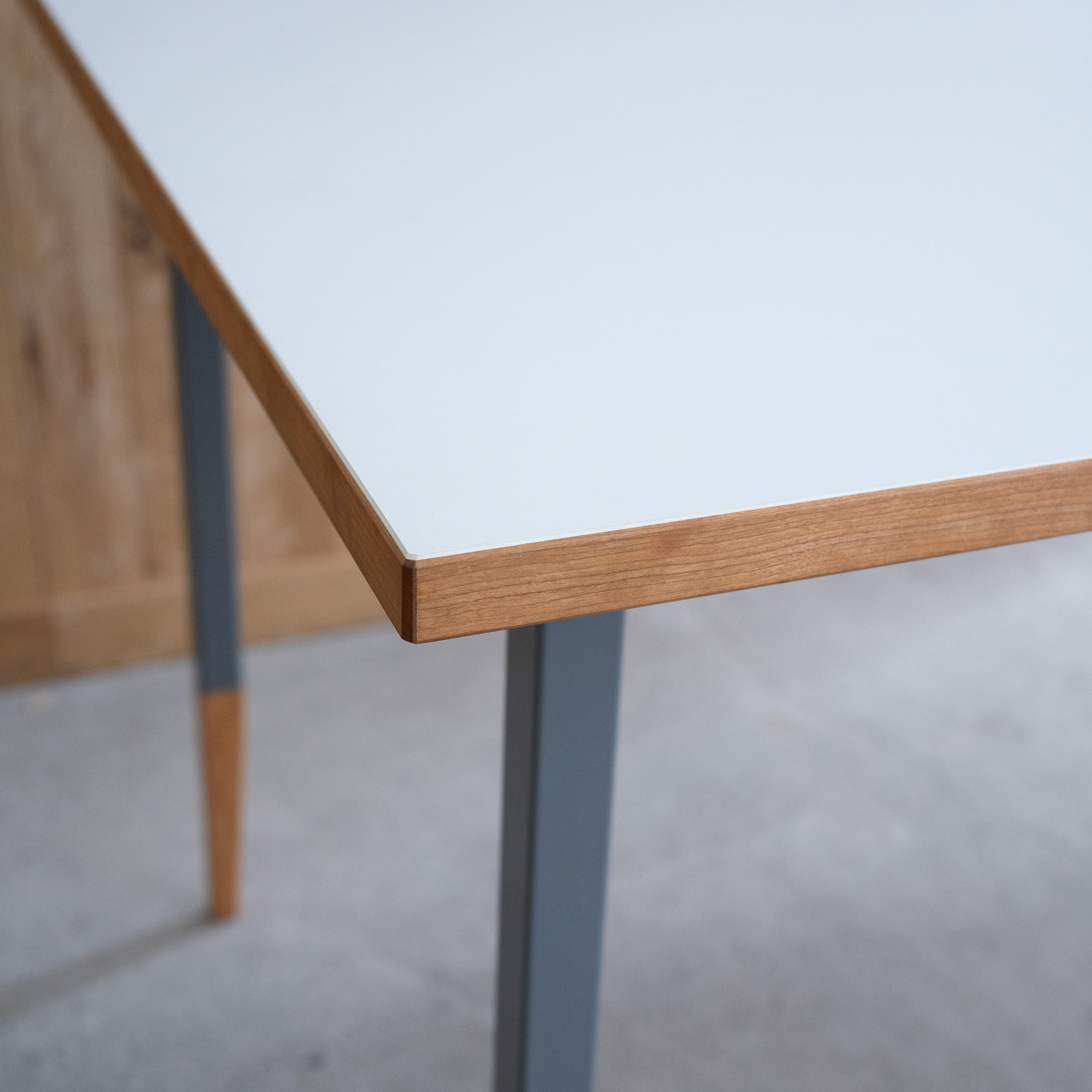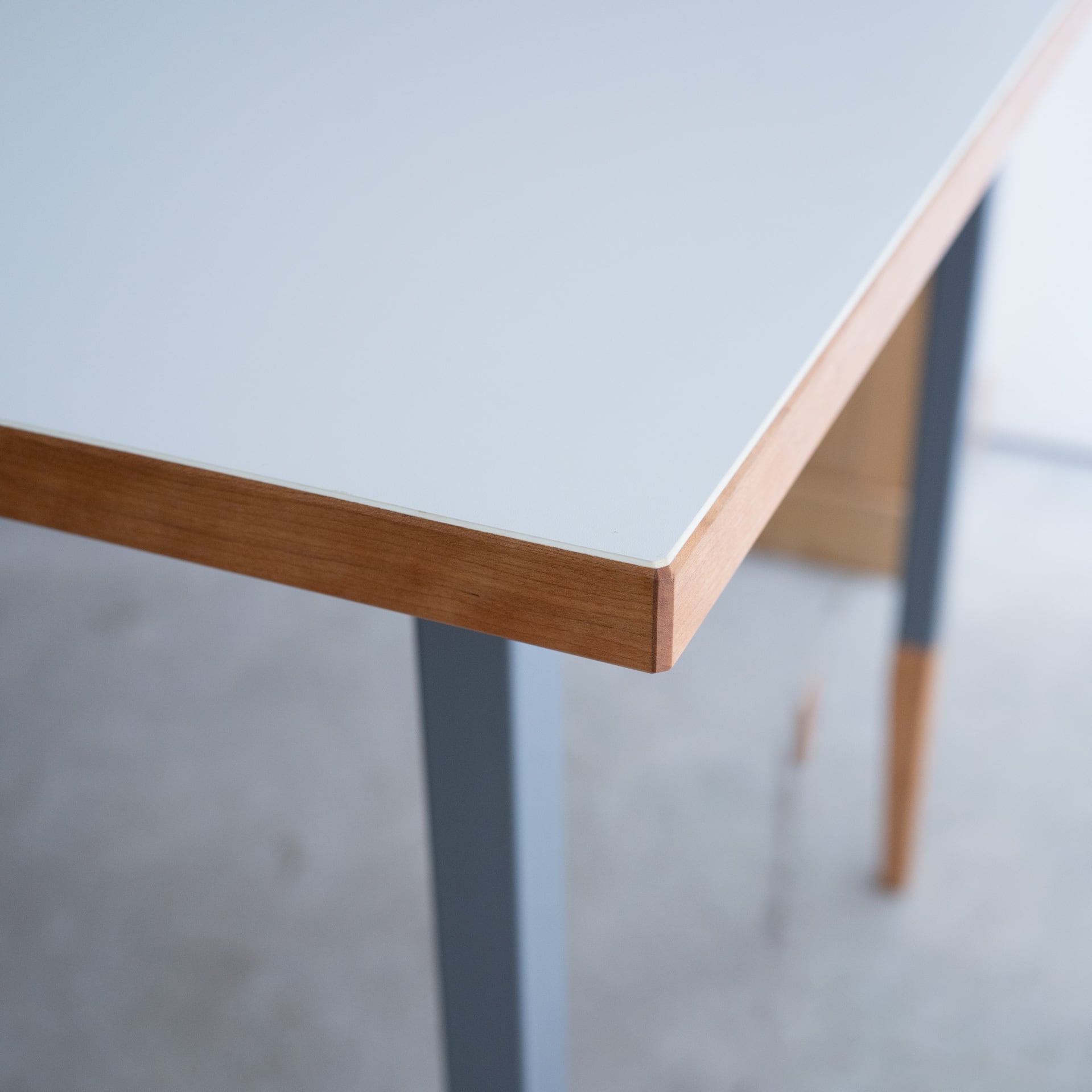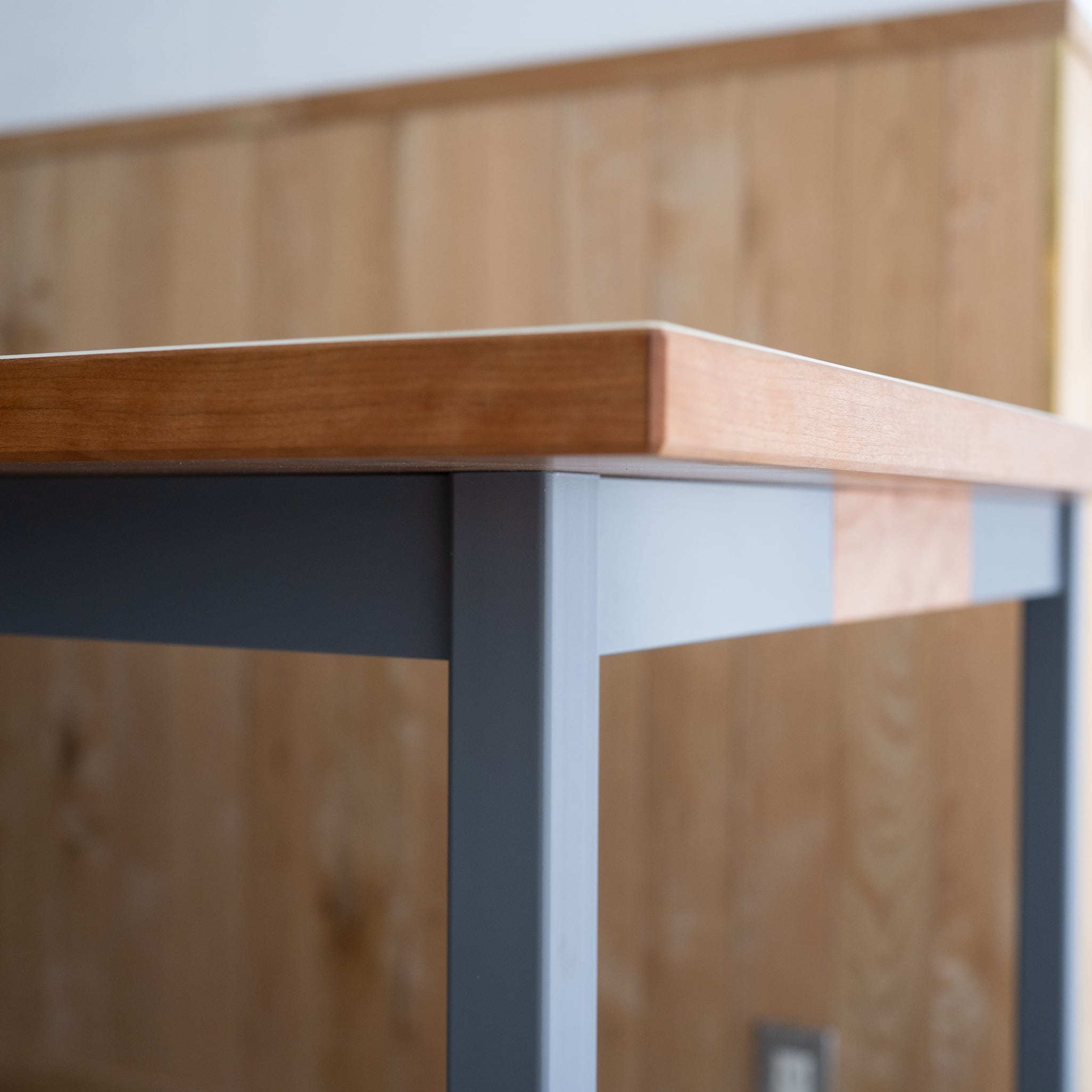メラミンという熱や衝撃に強い現代的な素材と、家具の素材として愛用されているチェリー材を組み合わせました。脚部の種類はスチールにグレーカラーの焼付と塗装。赤身をおびたチェリー材とも良く似合います。