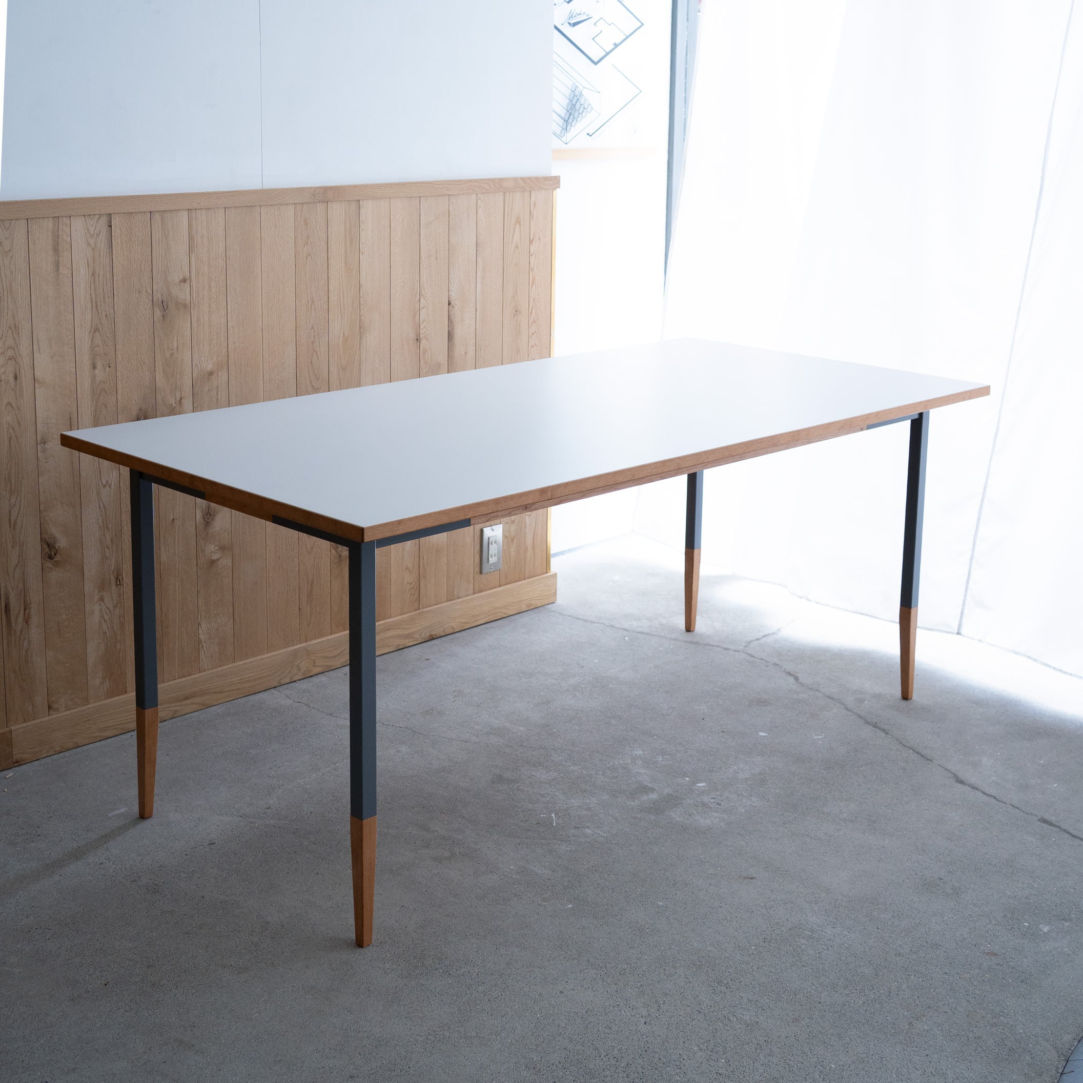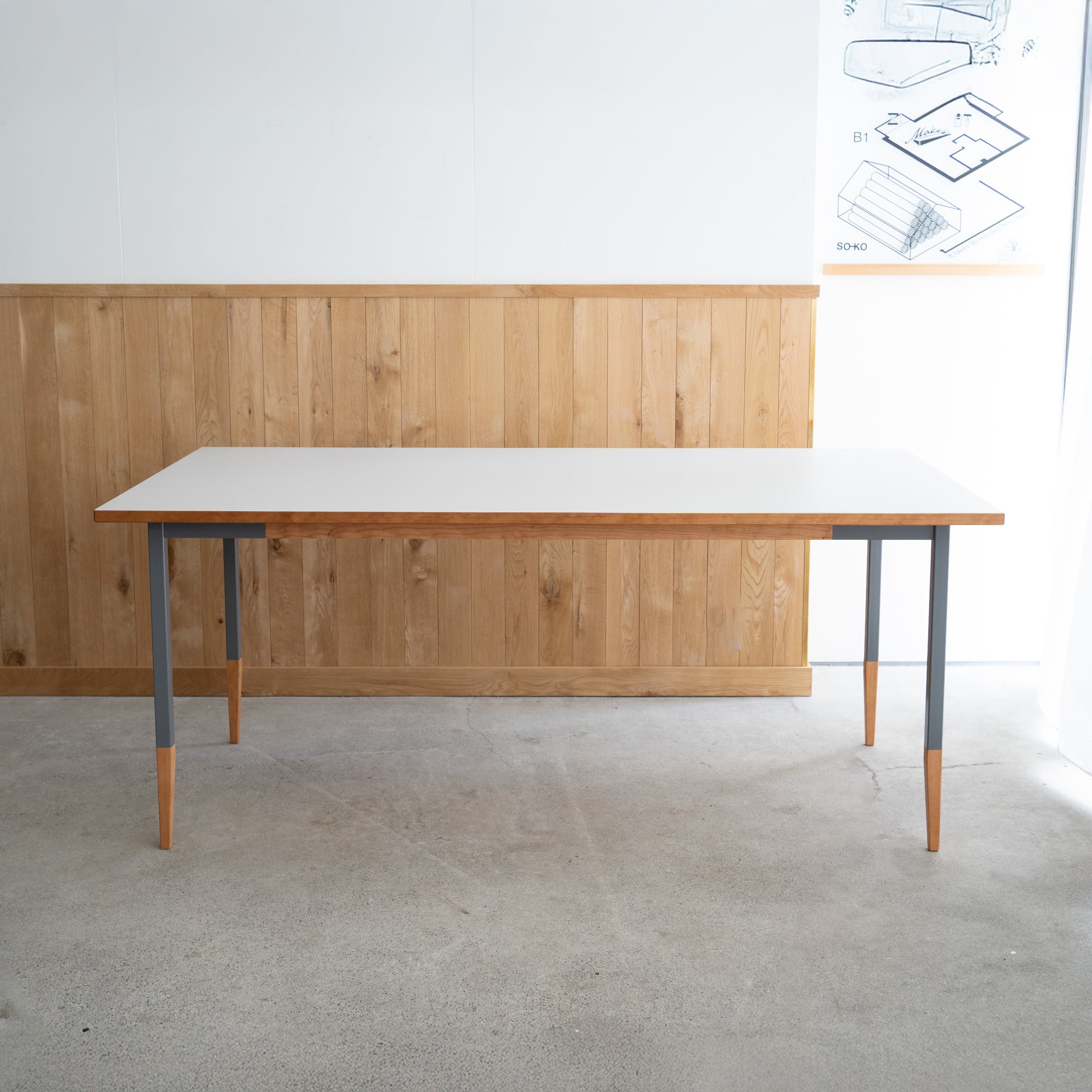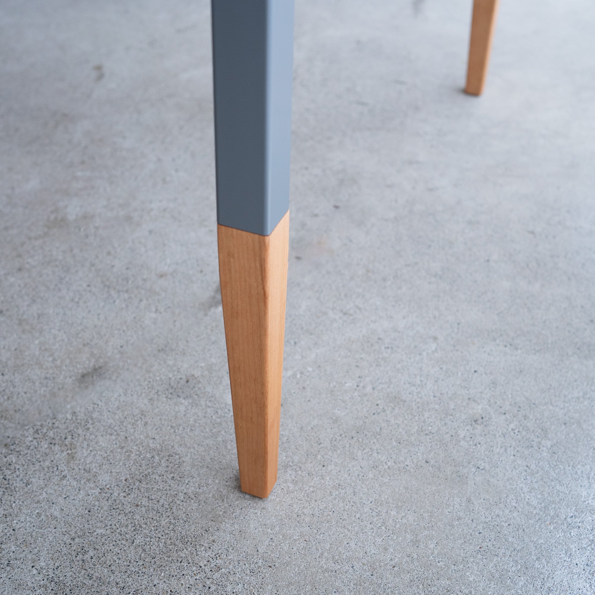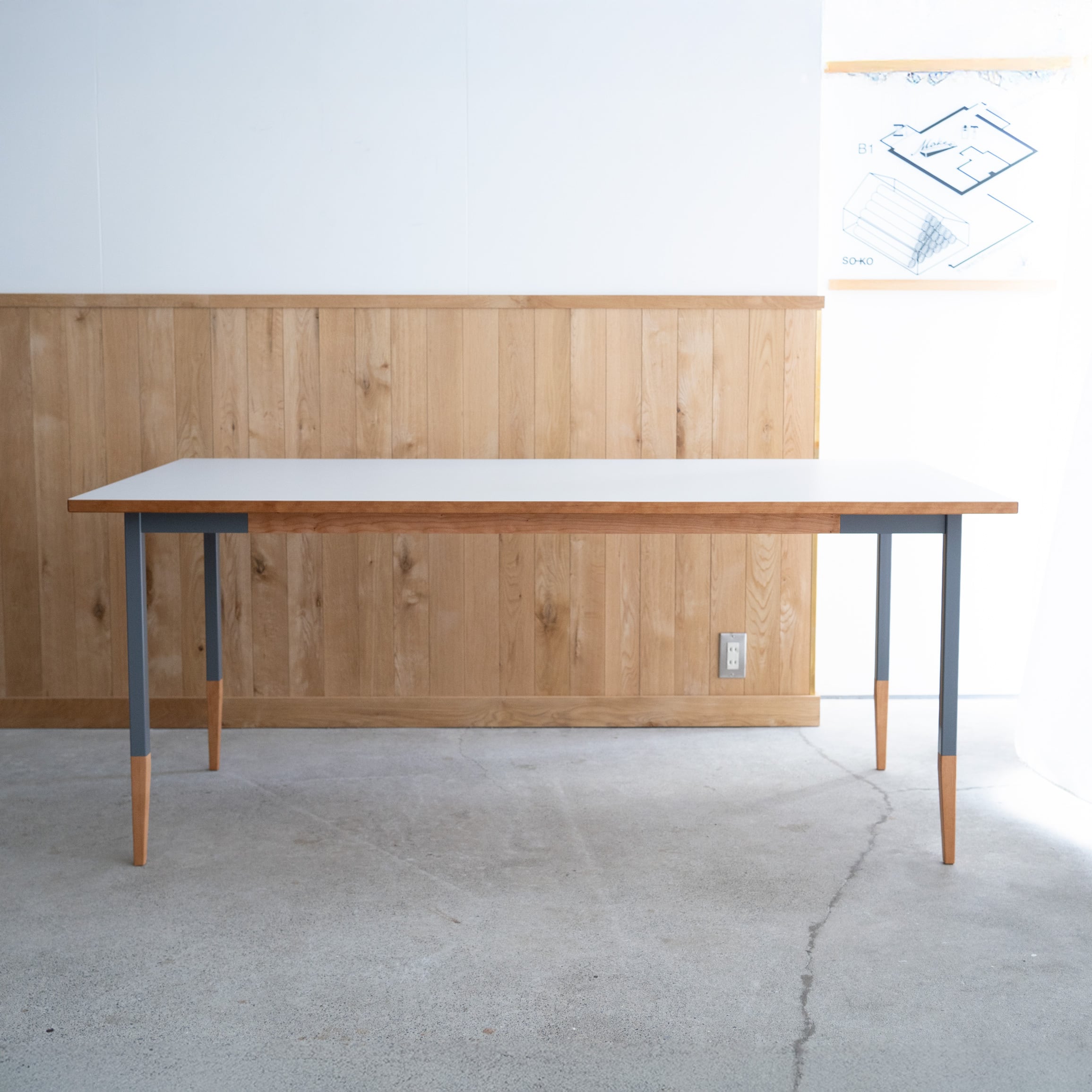 メラミンという熱や衝撃に強い現代的な素材と、家具の素材として愛用されているチェリー材を組み合わせました。脚部の種類はスチールにグレーカラーの焼付と塗装。赤身をおびたチェリー材とも良く似合います。
