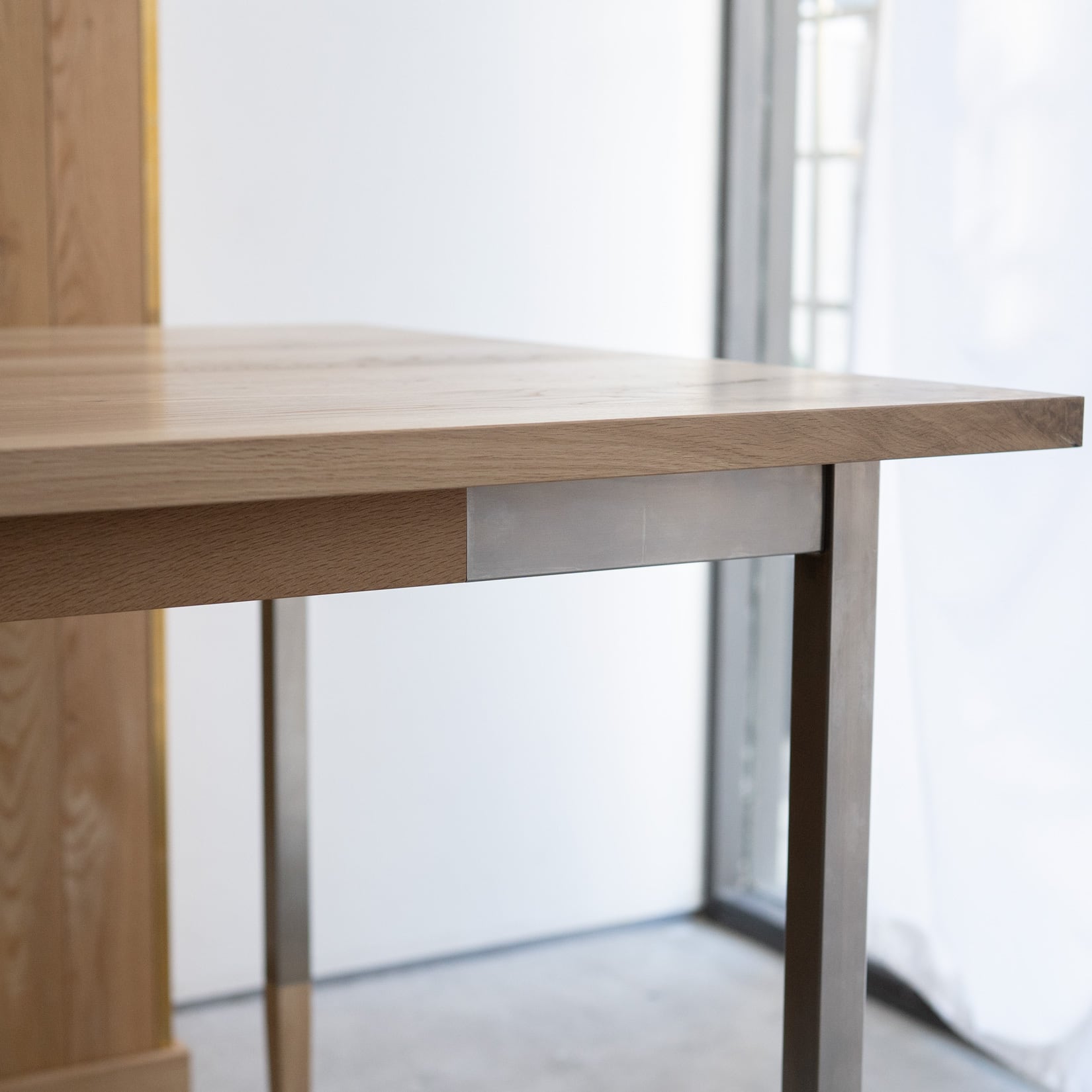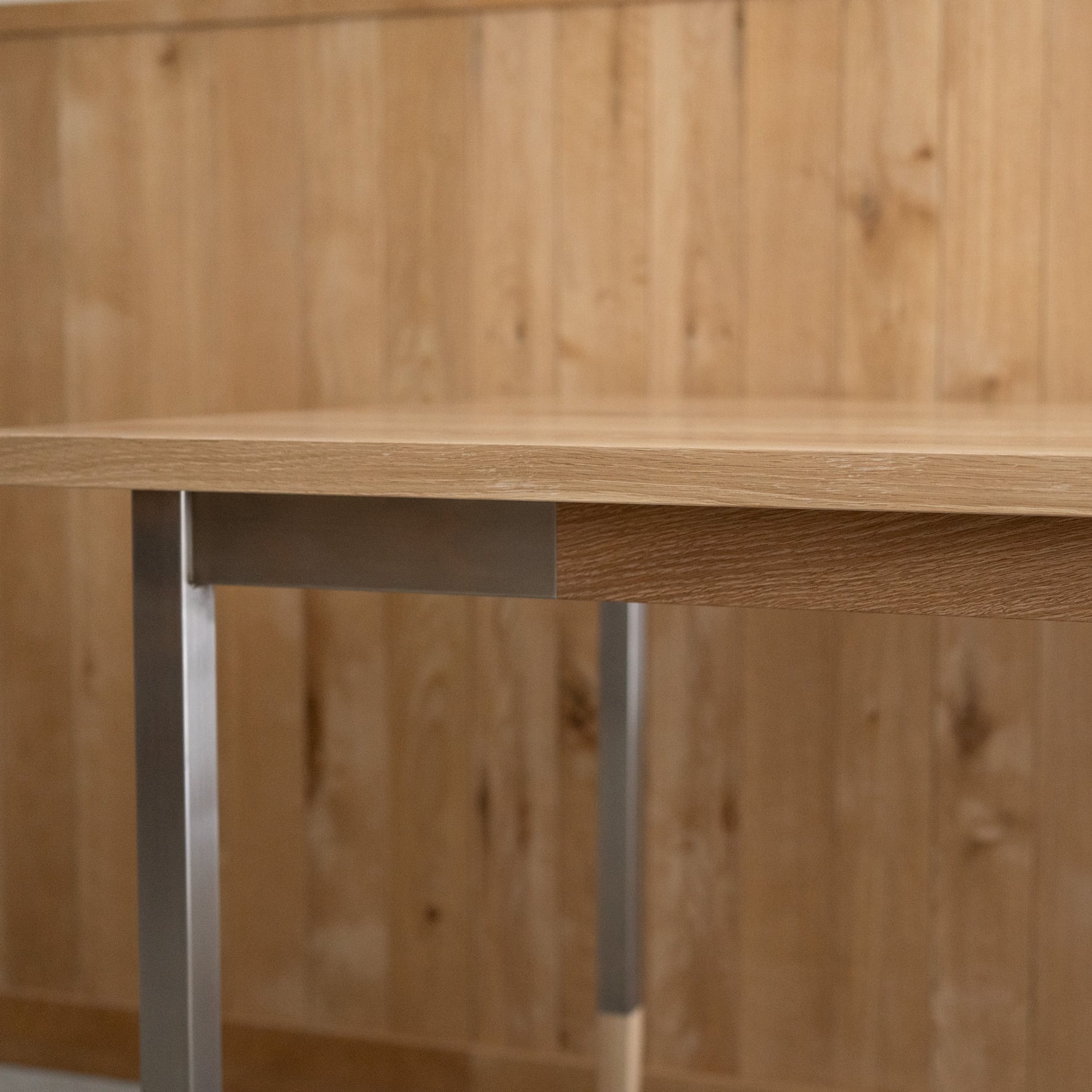 天板のナラ材は節有りのタイプ。ところどころに天然木ならではの節がはいっていてその周りは表情豊かな木目が洗われています。ナラは経年変化によりやや濃い褐色へと変化します。また、比較的硬い木質のためお使いいただくほどに魅力的な艶がでてきます。