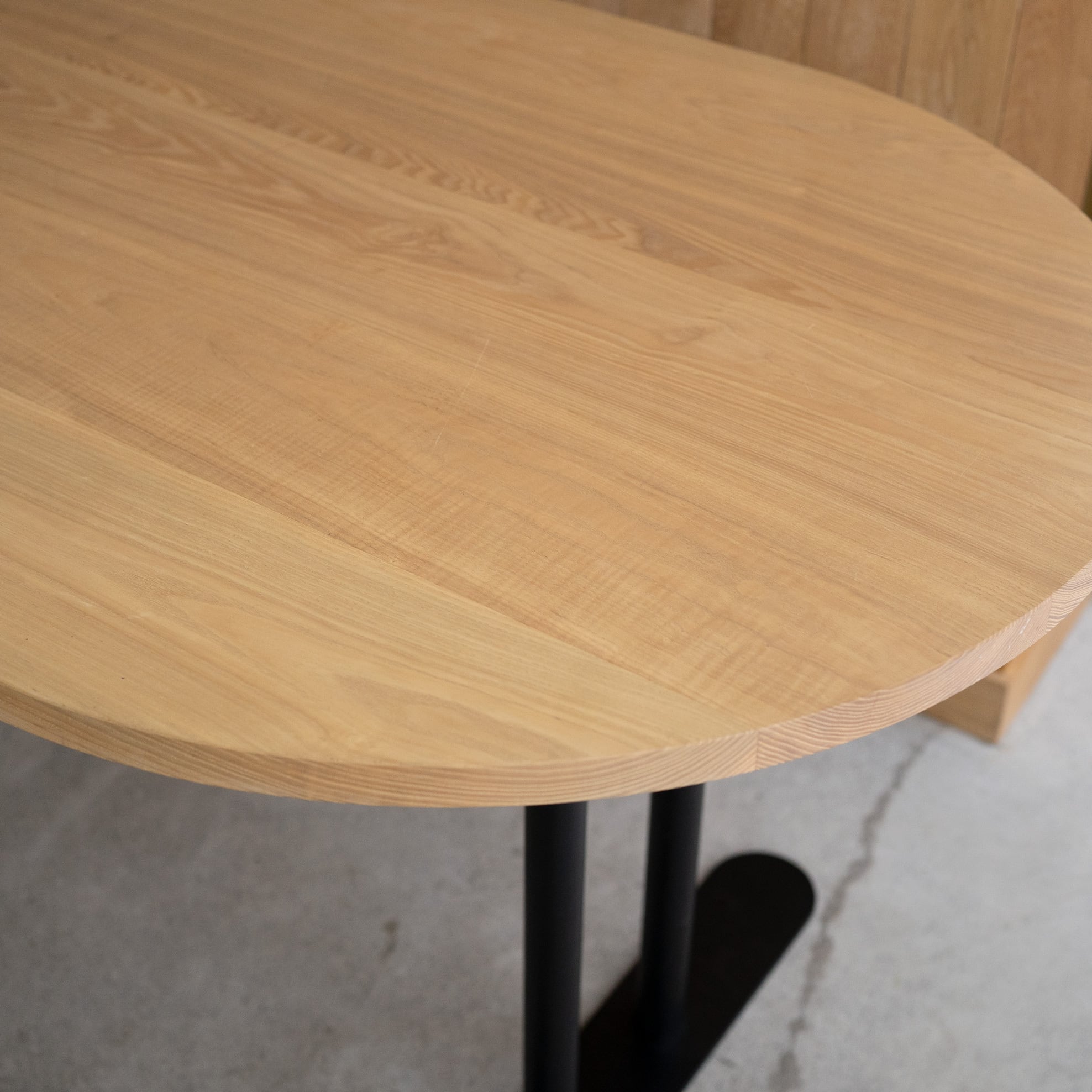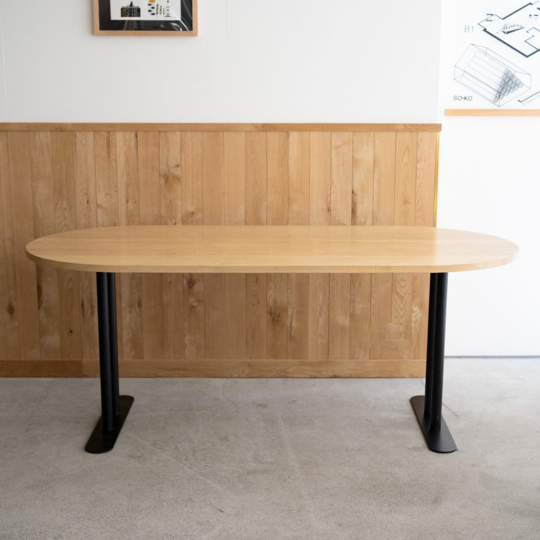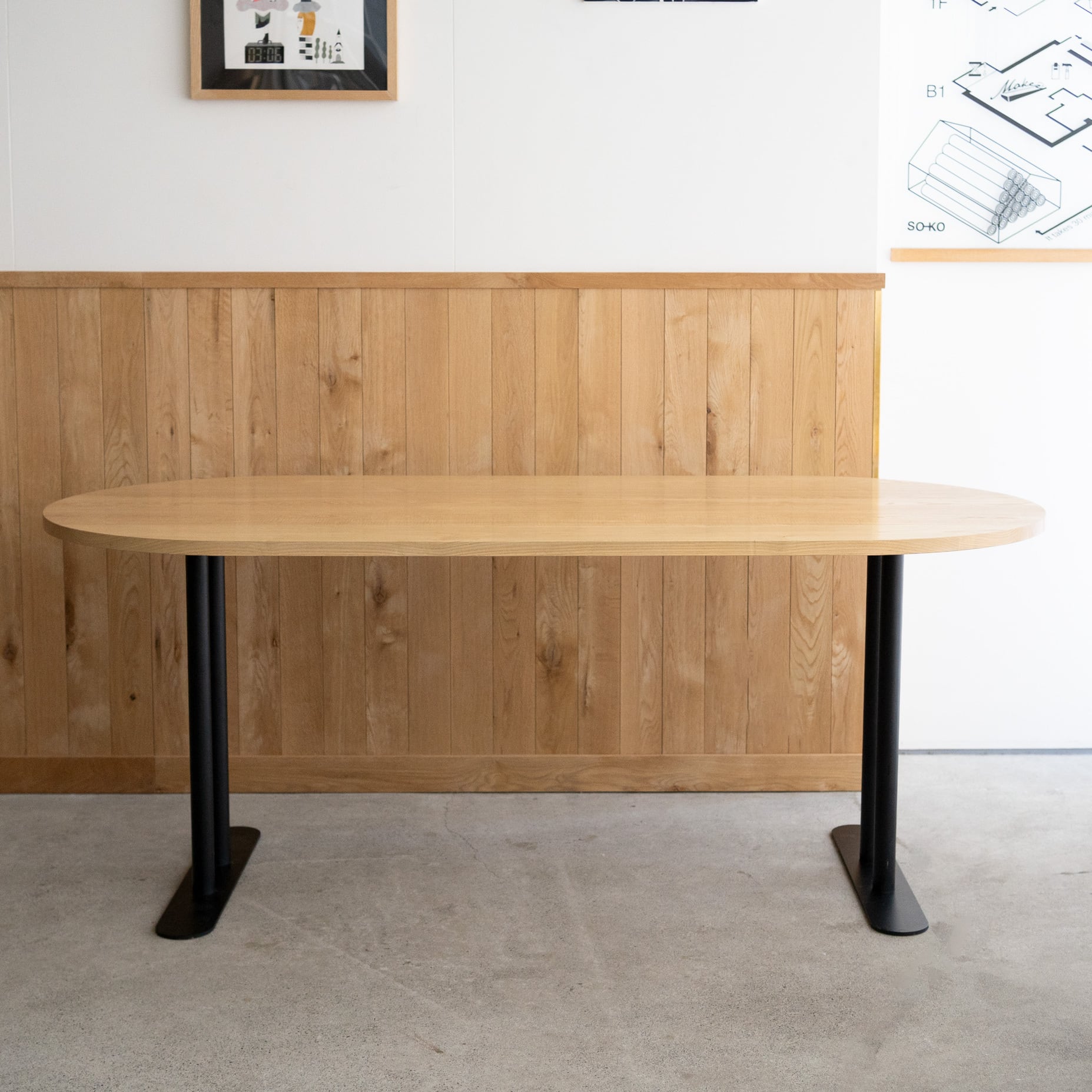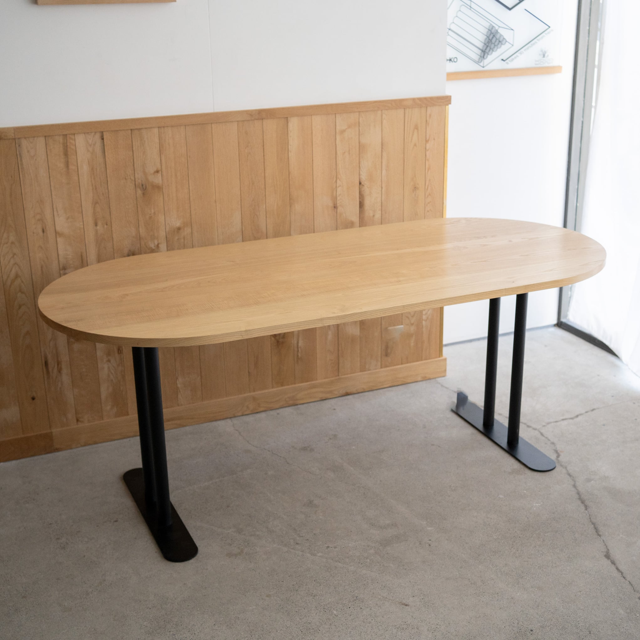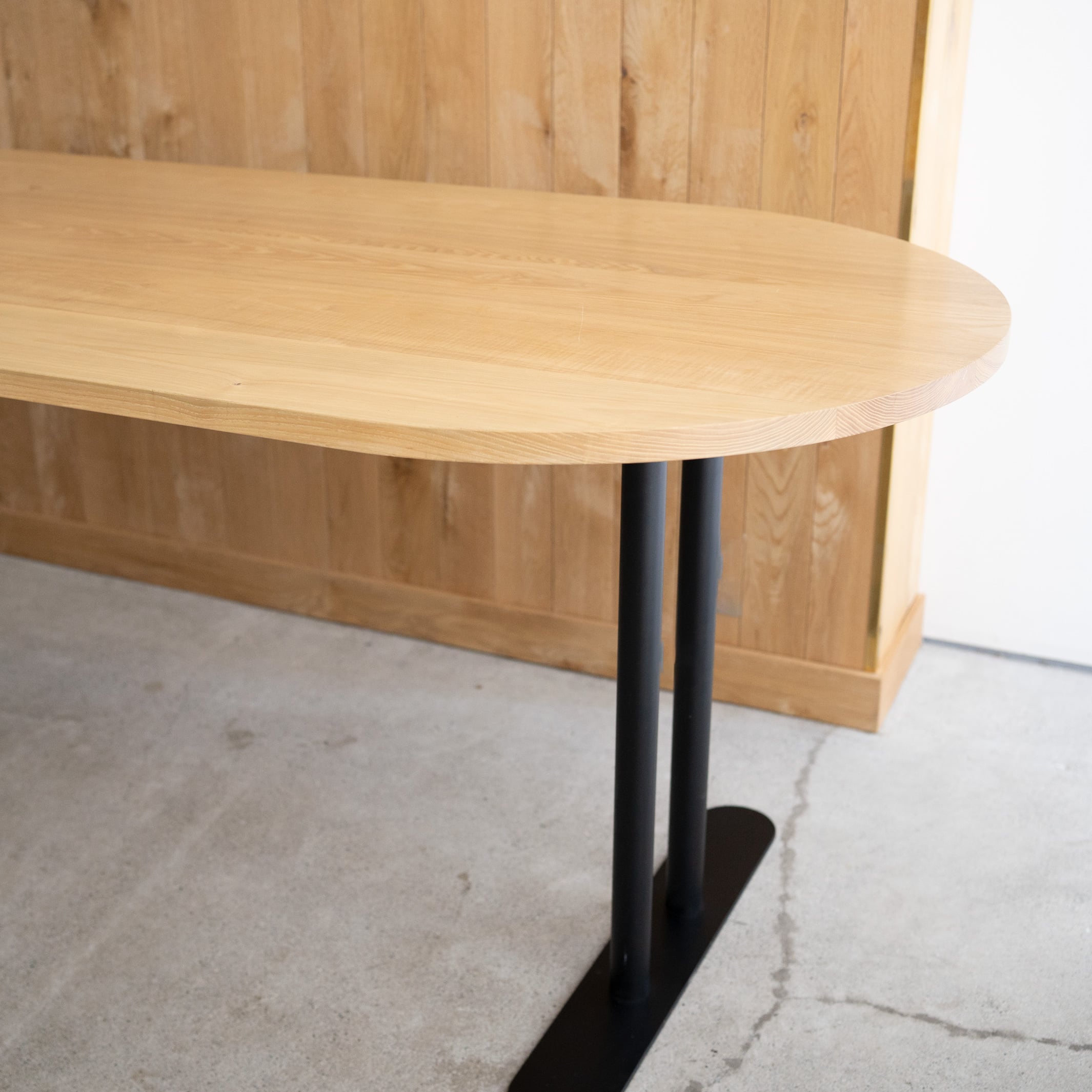 Hタイプのスチール脚部にオーバル(長楕円)のタモ材無垢天板を合わせたテーブルです。