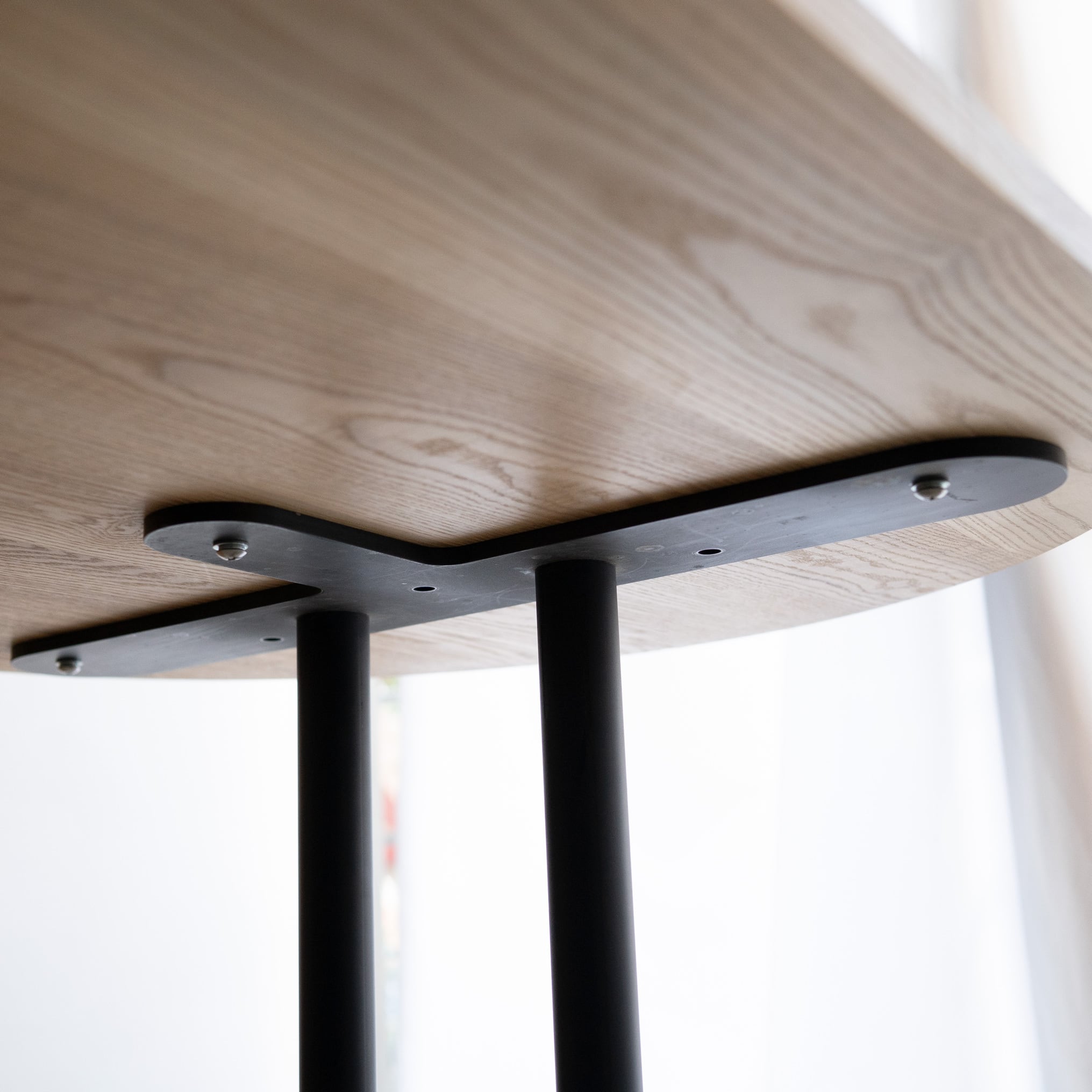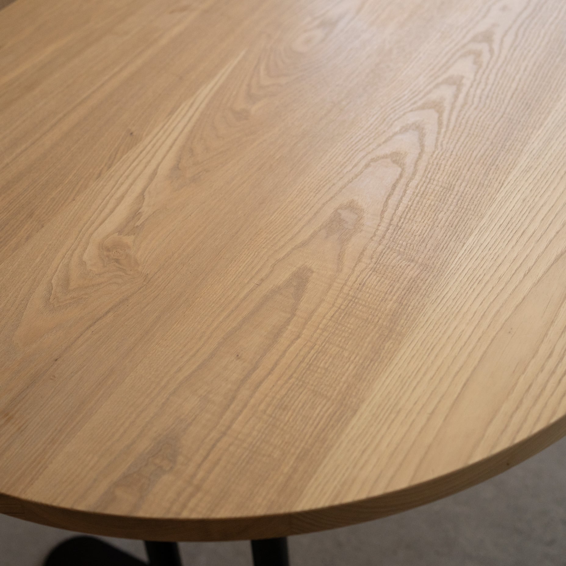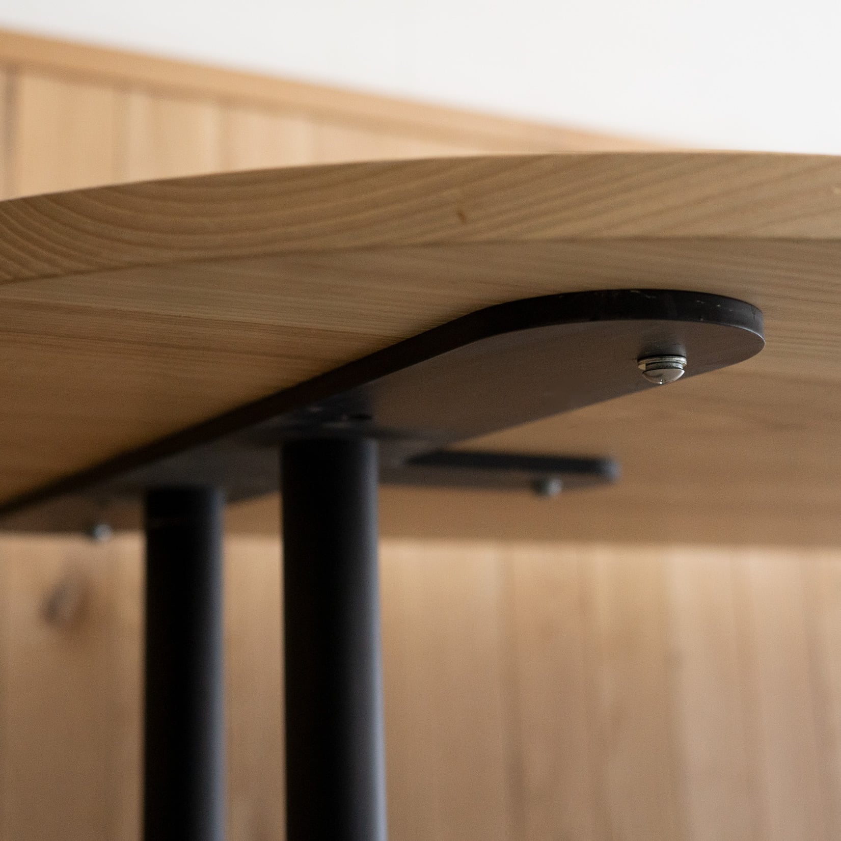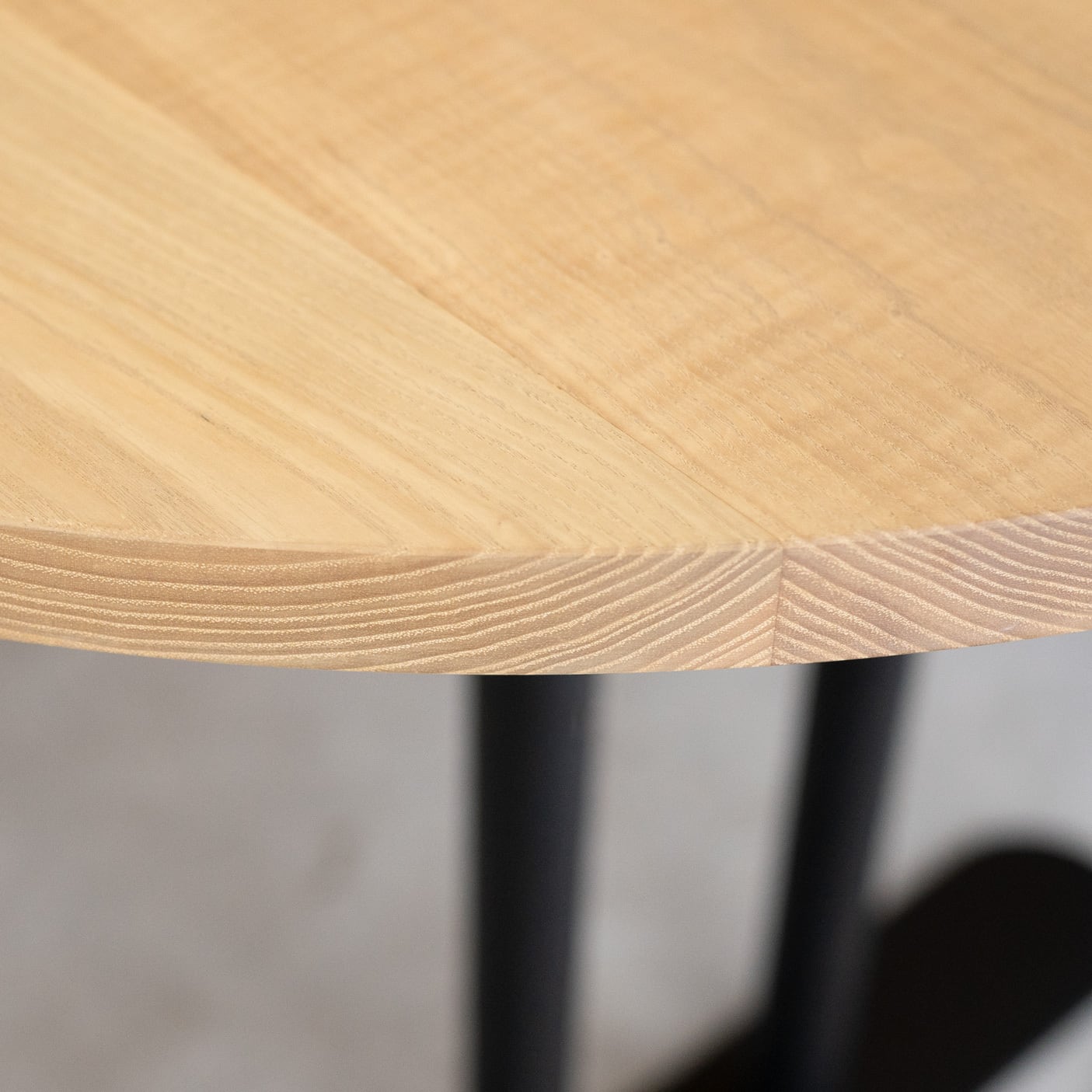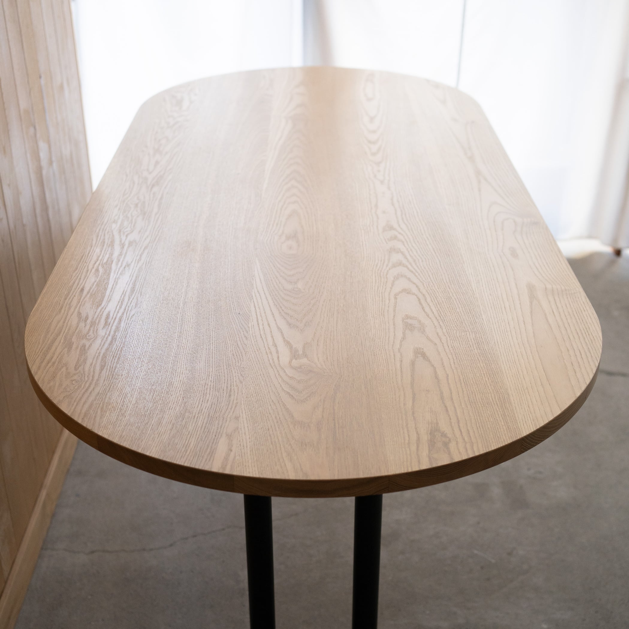 Hタイプのスチール脚部にオーバル(長楕円)のタモ材無垢天板を合わせたテーブルです。