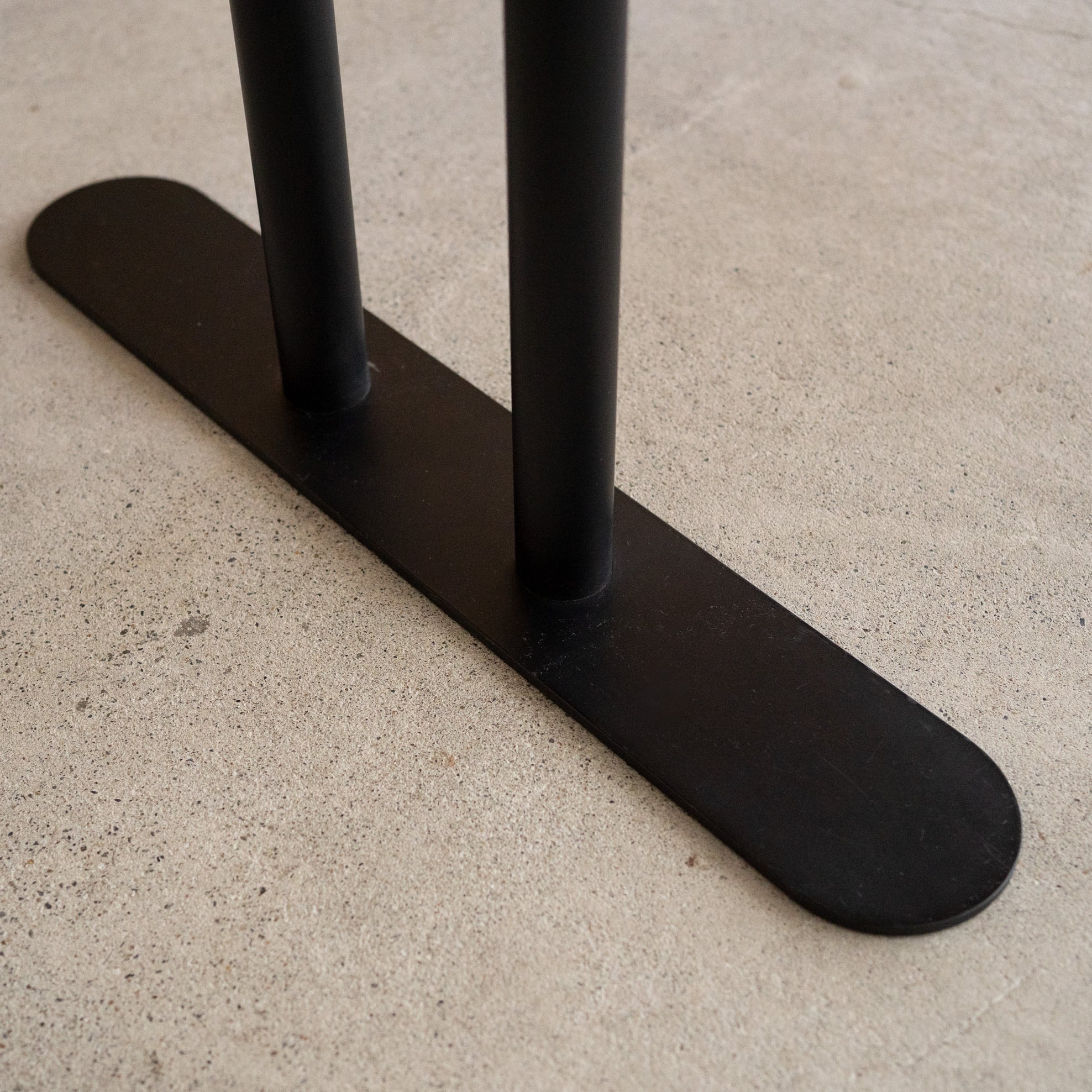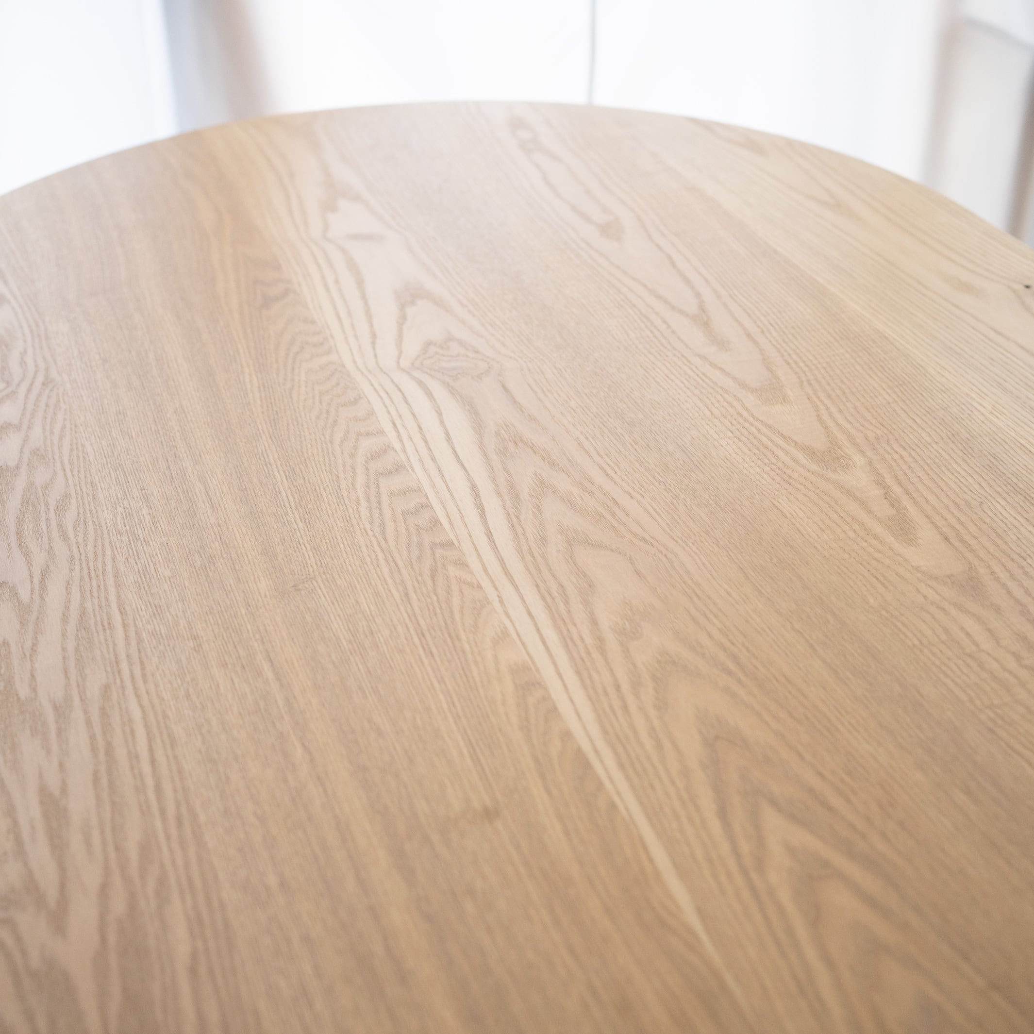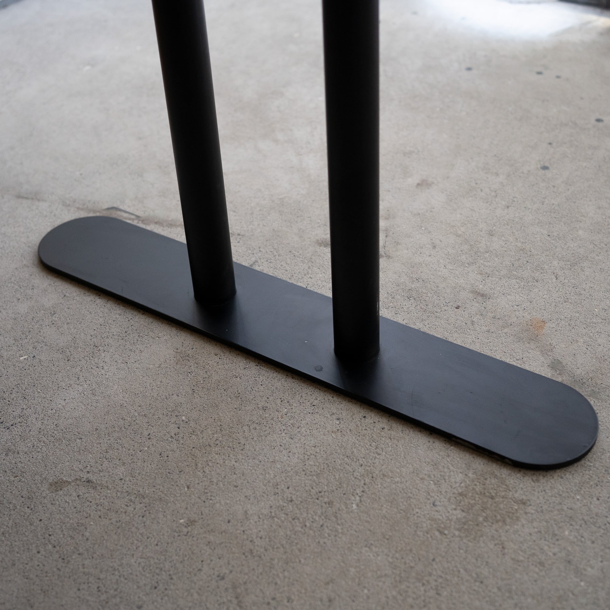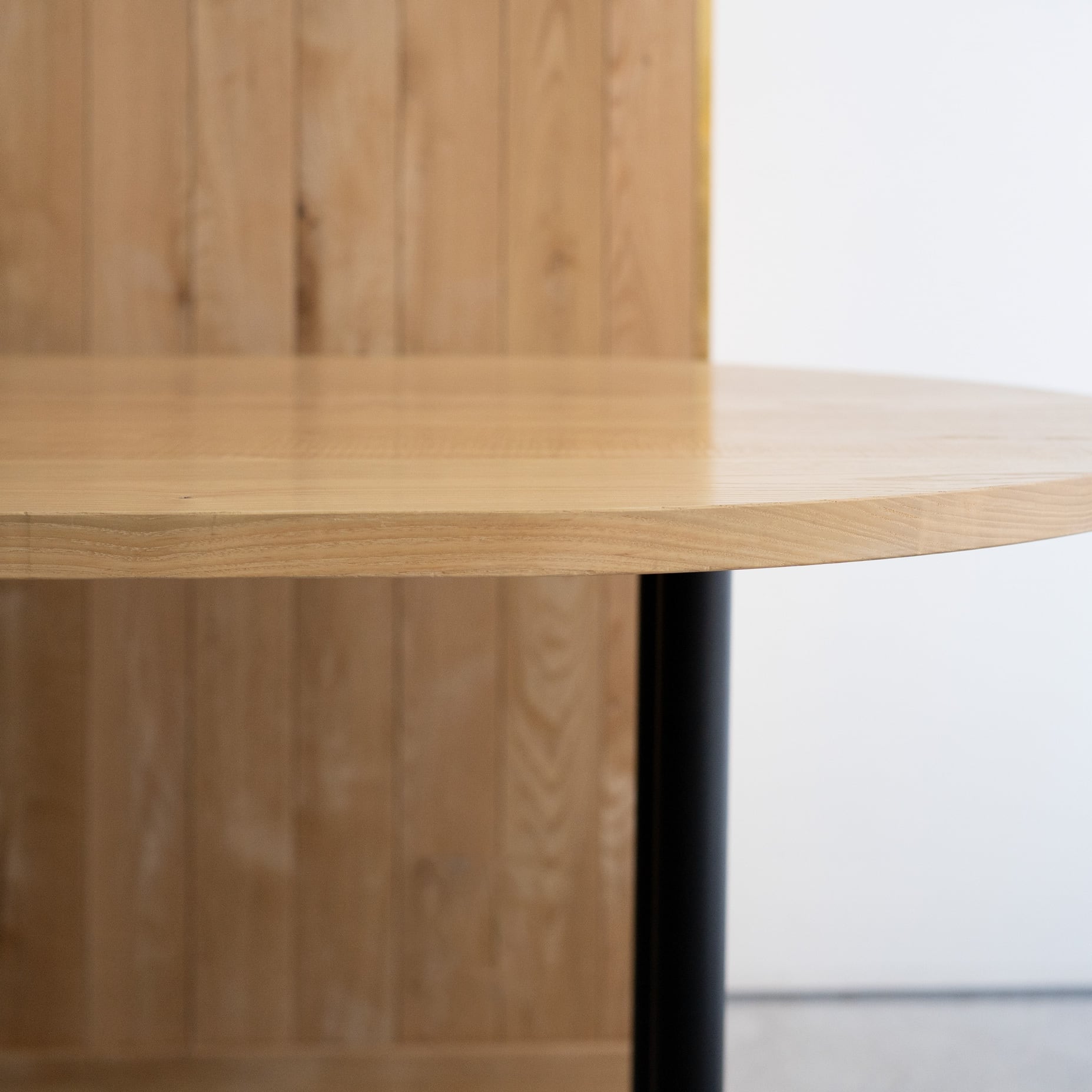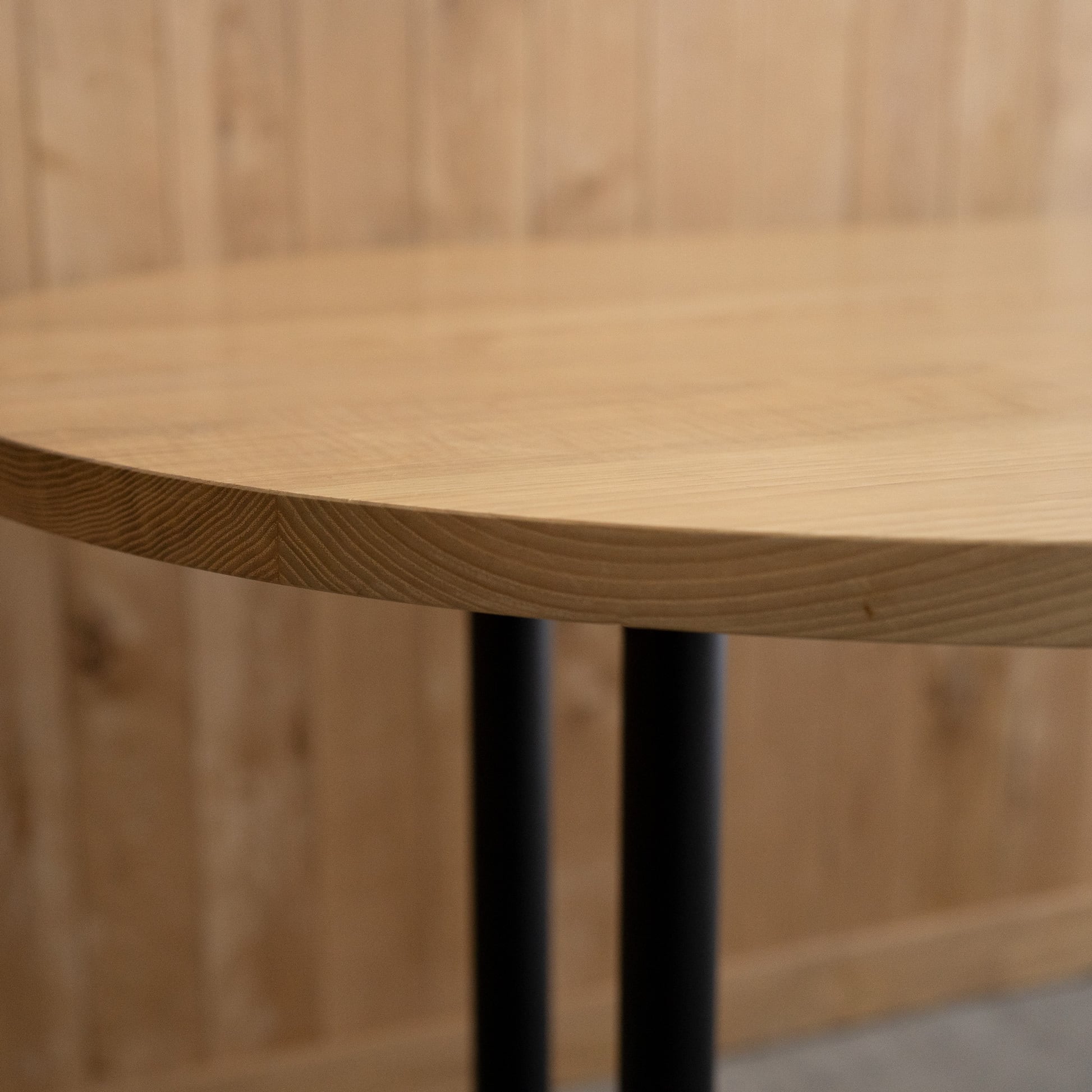 Hタイプのスチール脚部にオーバル(長楕円)のタモ材無垢天板を合わせたテーブルです。