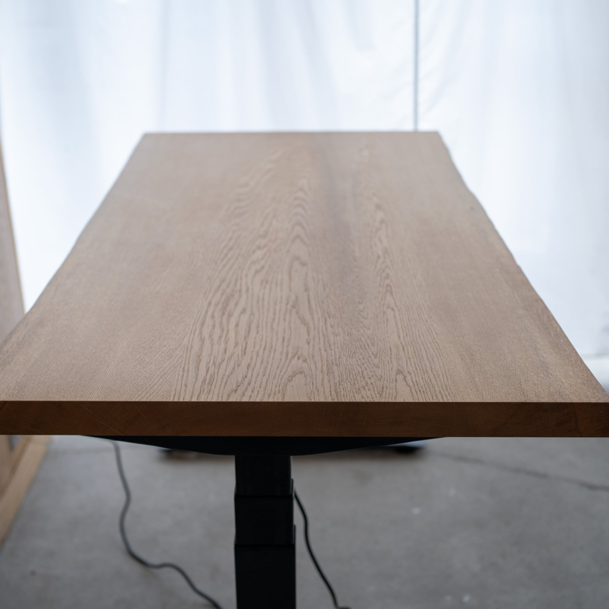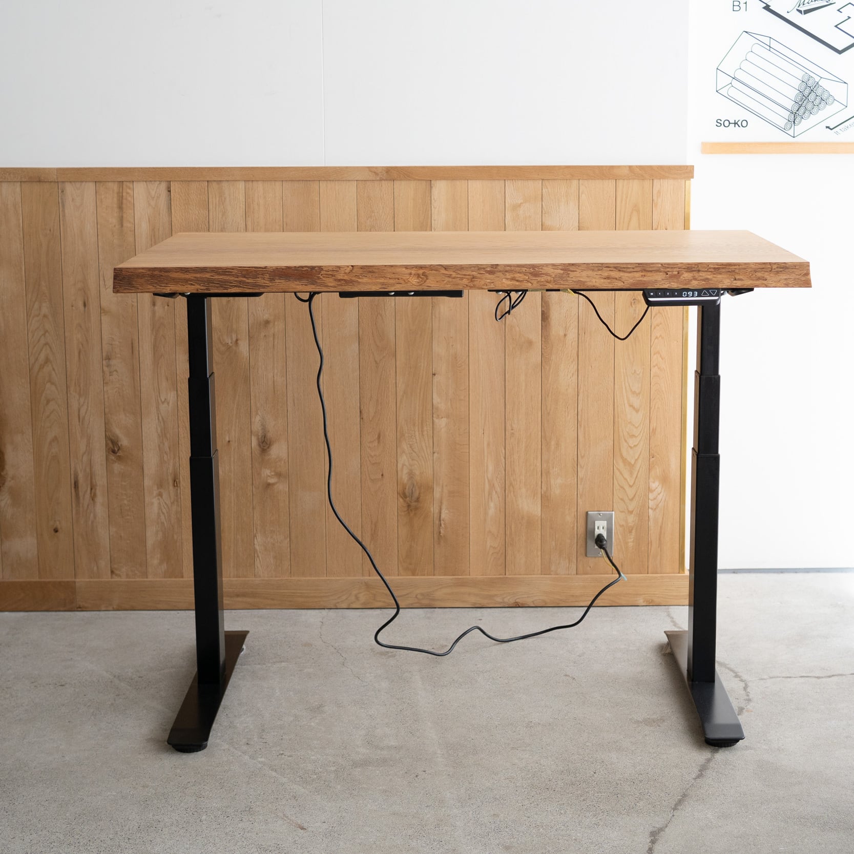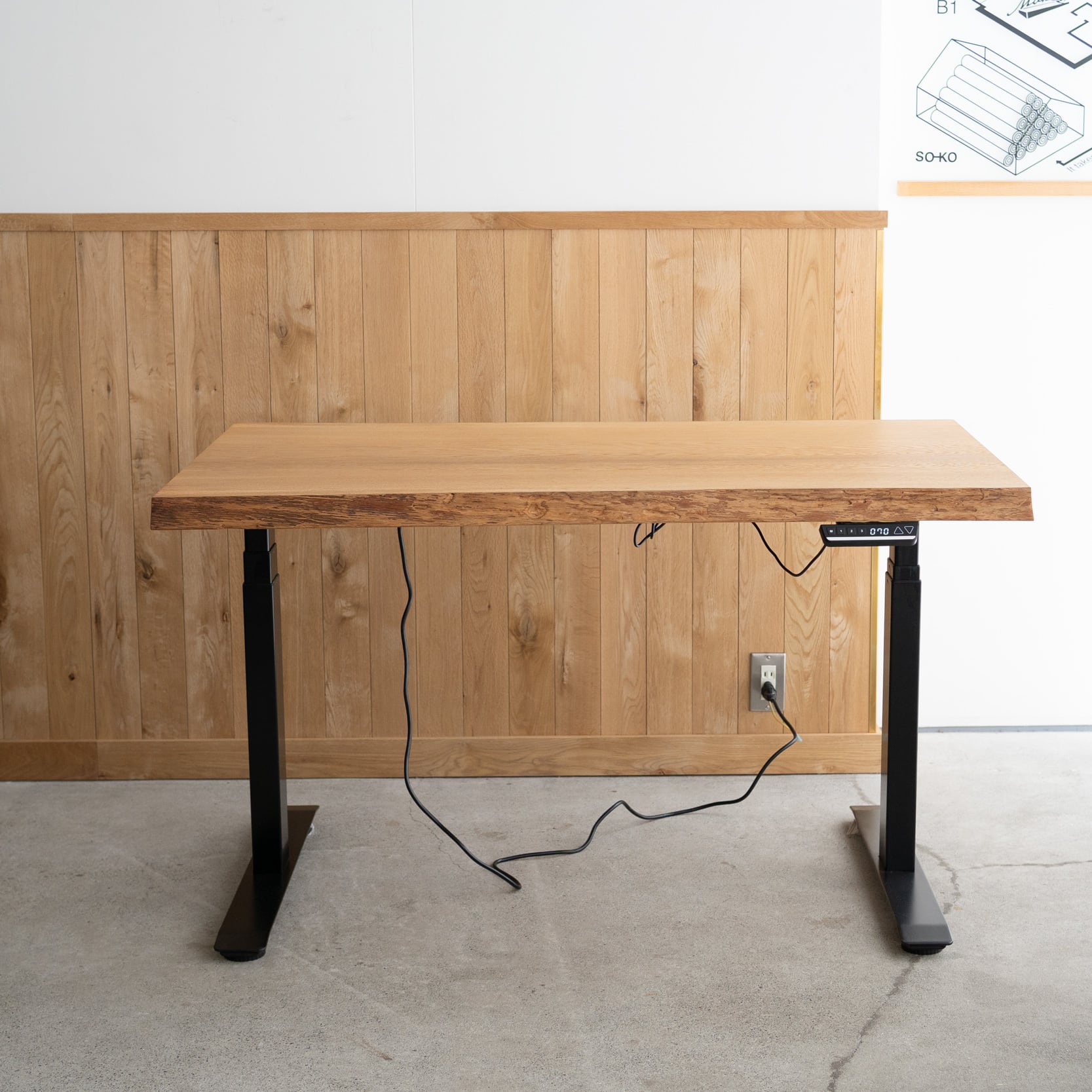 三枚接ぎのナラ材天板に昇降デスク用脚部を合わせたデスクです。