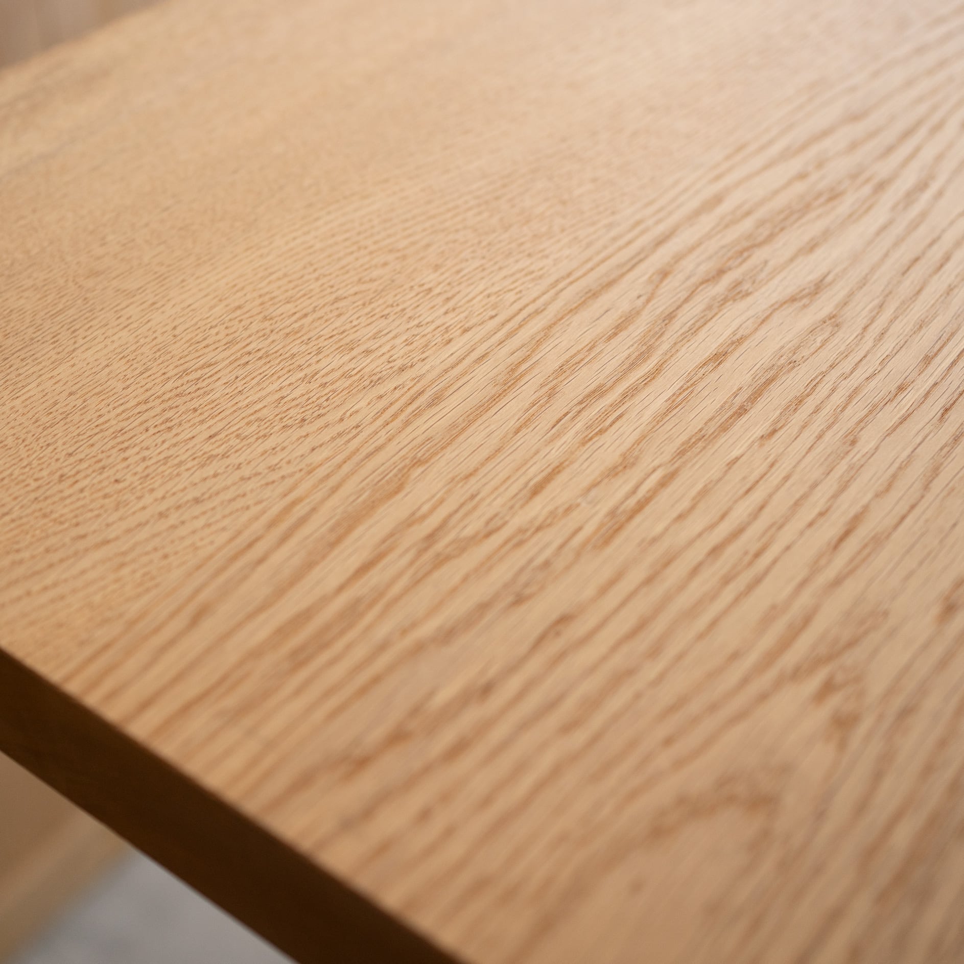 寒冷地で育つために木目(年輪)が緻密で穏やかな表情が現れるナラ材。特にこちらの天板は同じ丸太から切り出した共木(ともぎ)を接ぎ合わせていますので、木目の表情と色合いが揃っていて一見一枚板のように見えます。