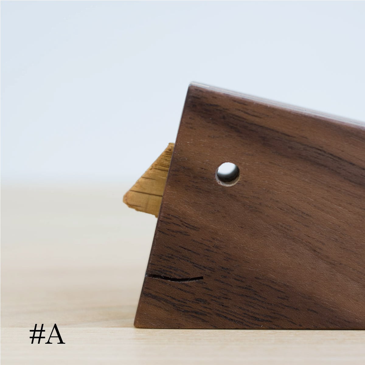 ウォールナット:紫がかった濃暗褐色と程よい硬さが特徴。チークやマホガニーと並ぶ3大銘木のひとつ。食用のクルミがとれる樹種としても知られる。経年変化により暗褐色から温かみのある茶色に変化する。