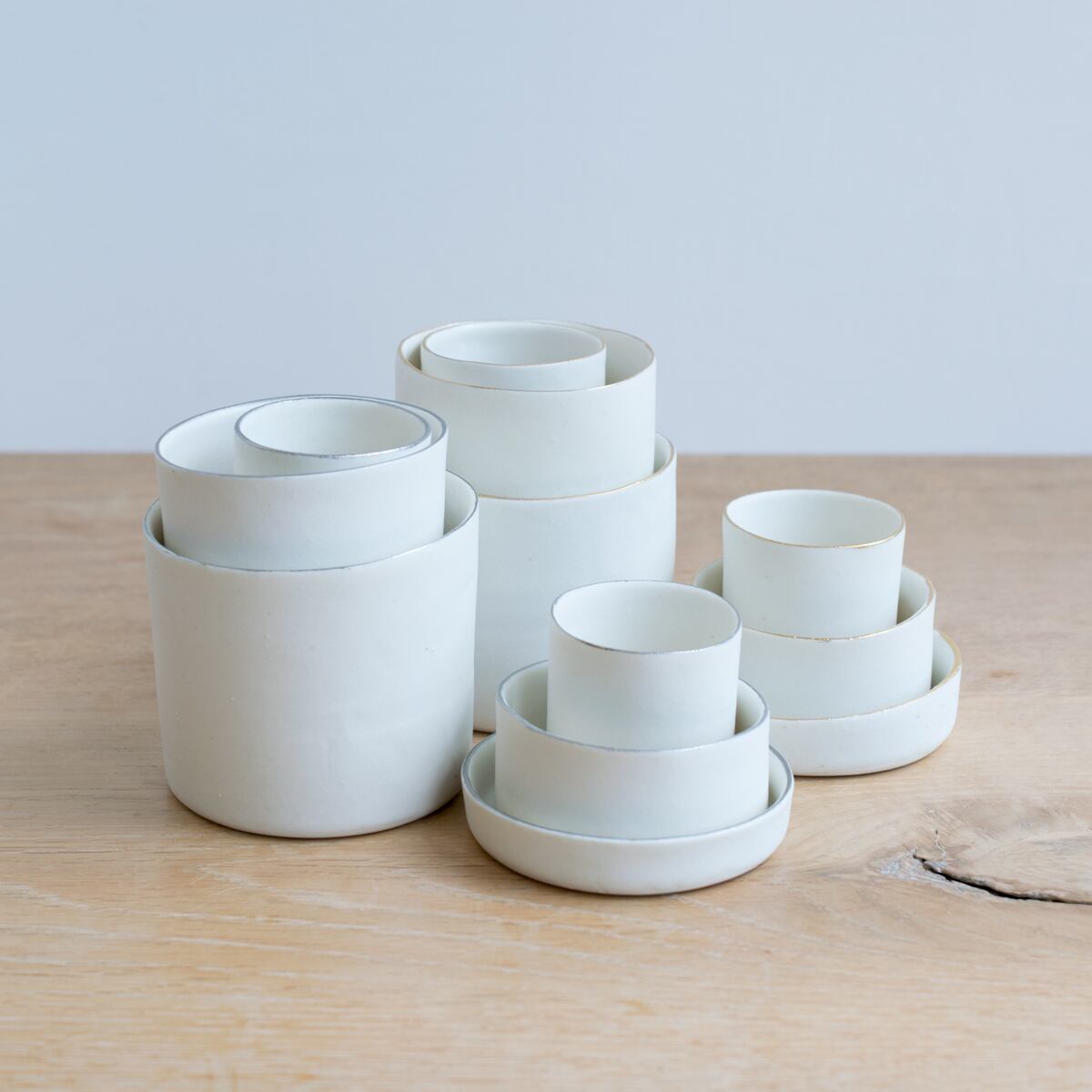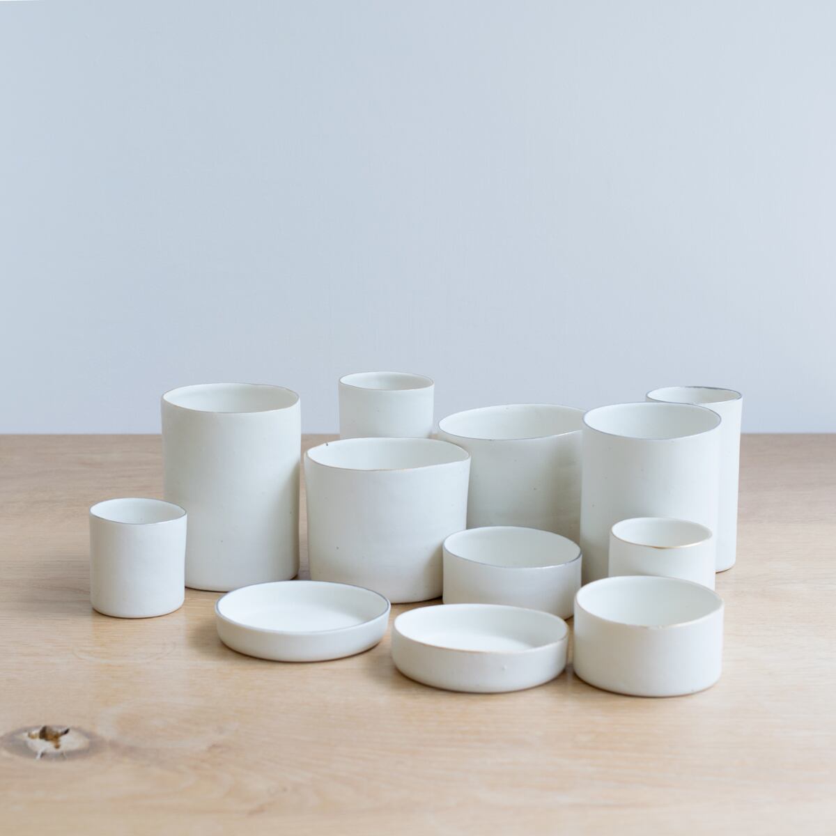 筒状の型の中に液体の土を流し込んで作るこのシリーズは、流し込む土の深さを変えることで、お皿やコップなど違ったうつわになります。土を流し込んだ後に表れる水面のかたちをそのまま残すことで、一つ一つに特別な表情が生まれます。