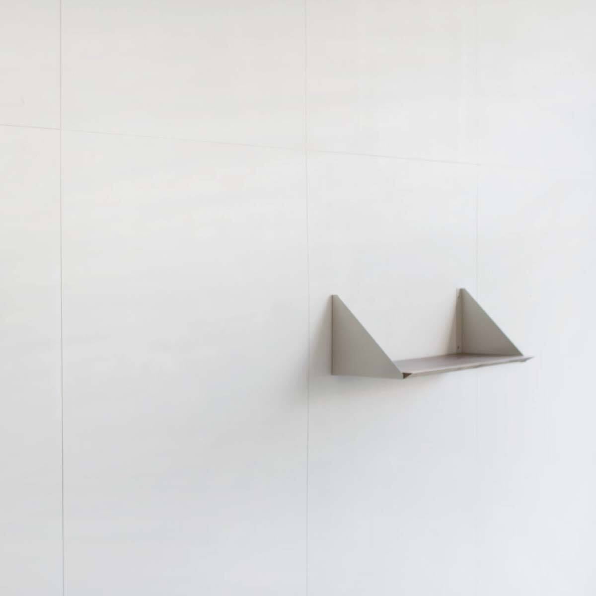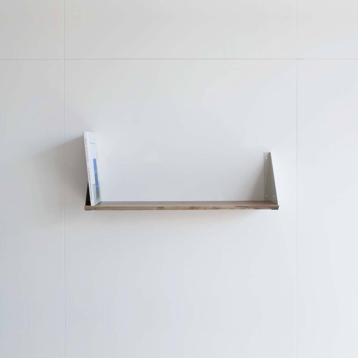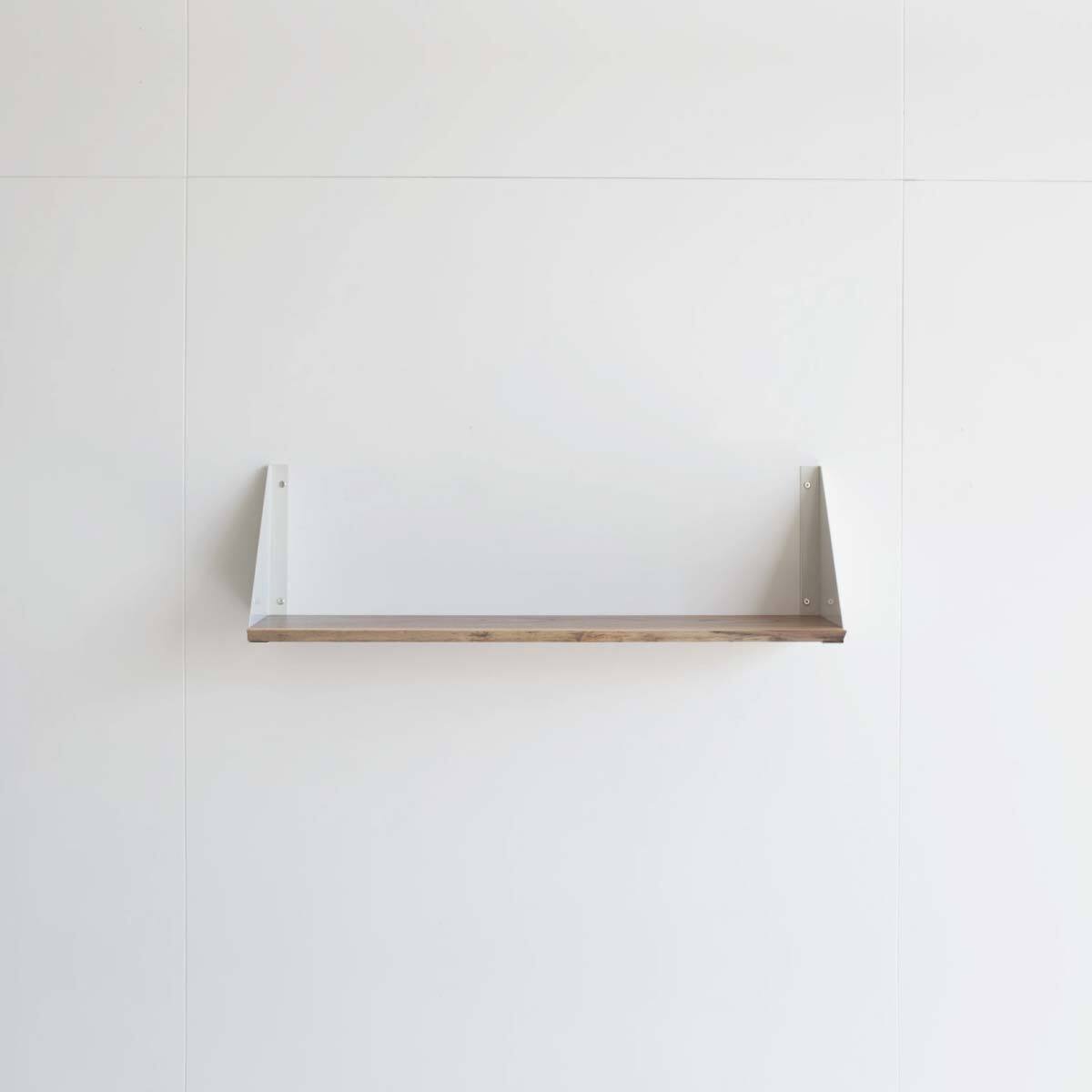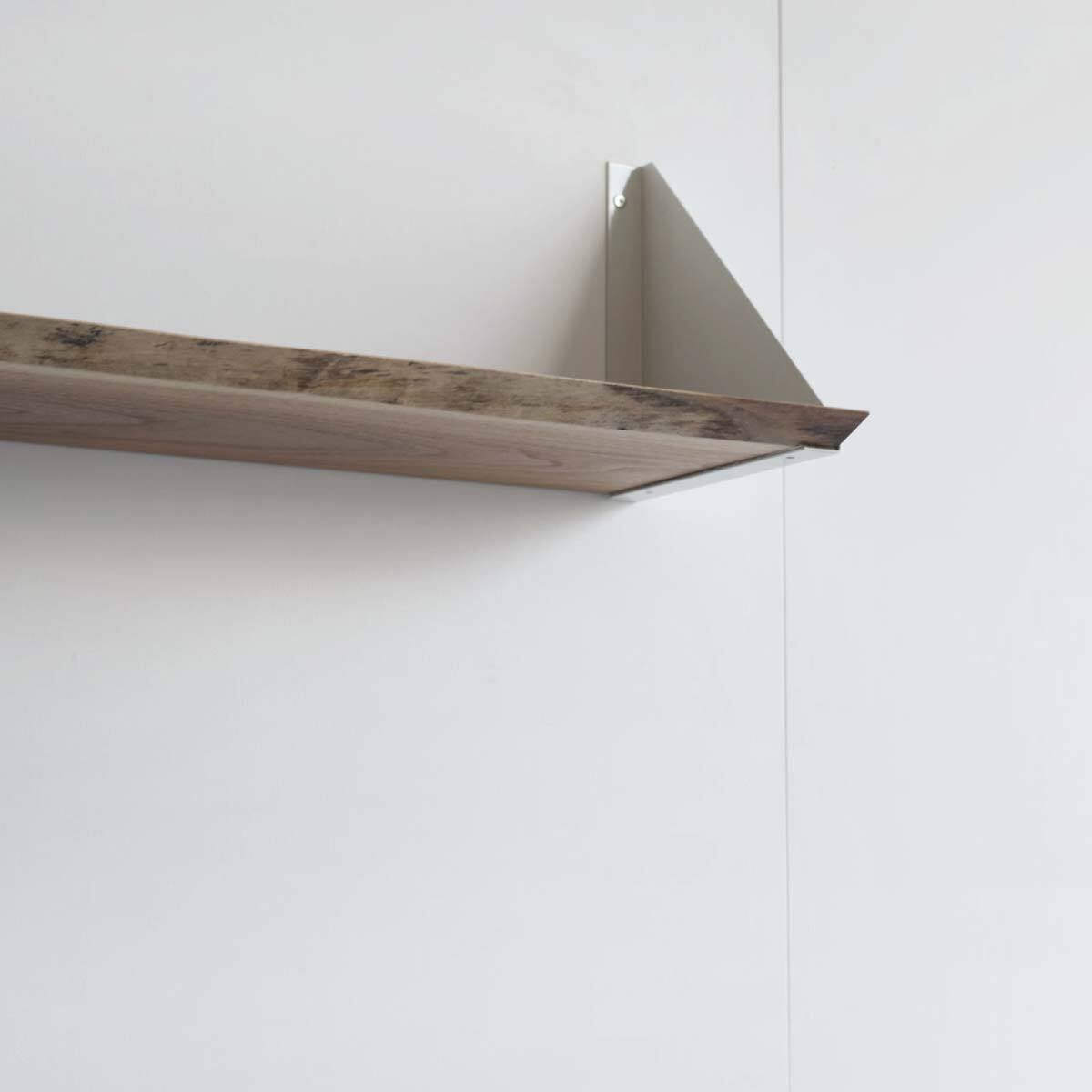 ミミ付きのウォールナット一枚板と、三角形のシルエットが印象的な金属製のブランケットを組み合わせたシェルフ。完成品での販売です。
