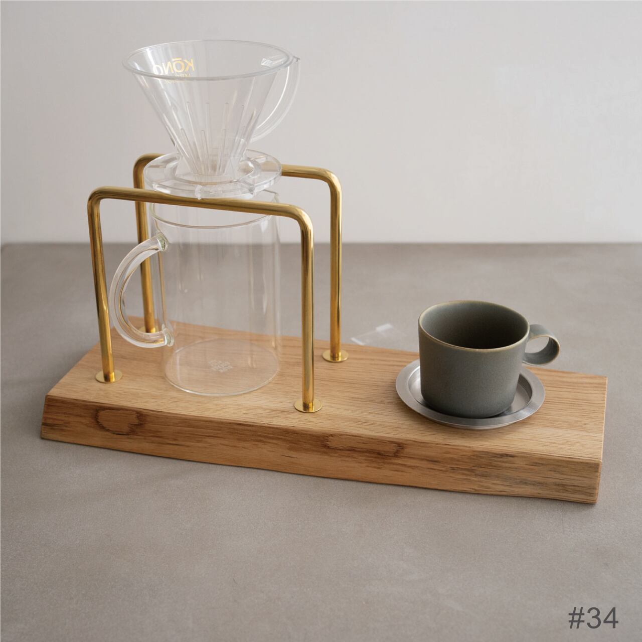 素材がもつかたちや大きさを活かした無垢の木のベースに、オリジナルの真鍮パーツを組み合わせ、色合いや木目の違いだけでなく、ミミや節も個性としてそのままに活かしているので、それぞれが世界にひとつだけのドリップスタンドになります。